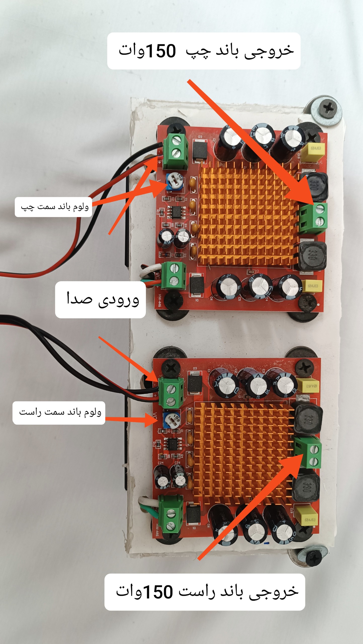 دو عدد آمپلی فایر مونو 150 وات 4 تا 8 اهم جز این باند ها هر باند دیگه ای میتونید وصل کنید داخل باکس آمپلی فایر یک آداپتور 24 ولت 5 امپر نصب شده که از حداکثر توان میتوان استفاده کرد و چون دو عدد باند دو عدد آمپلی فایر هست صدای استریو بهتون میده