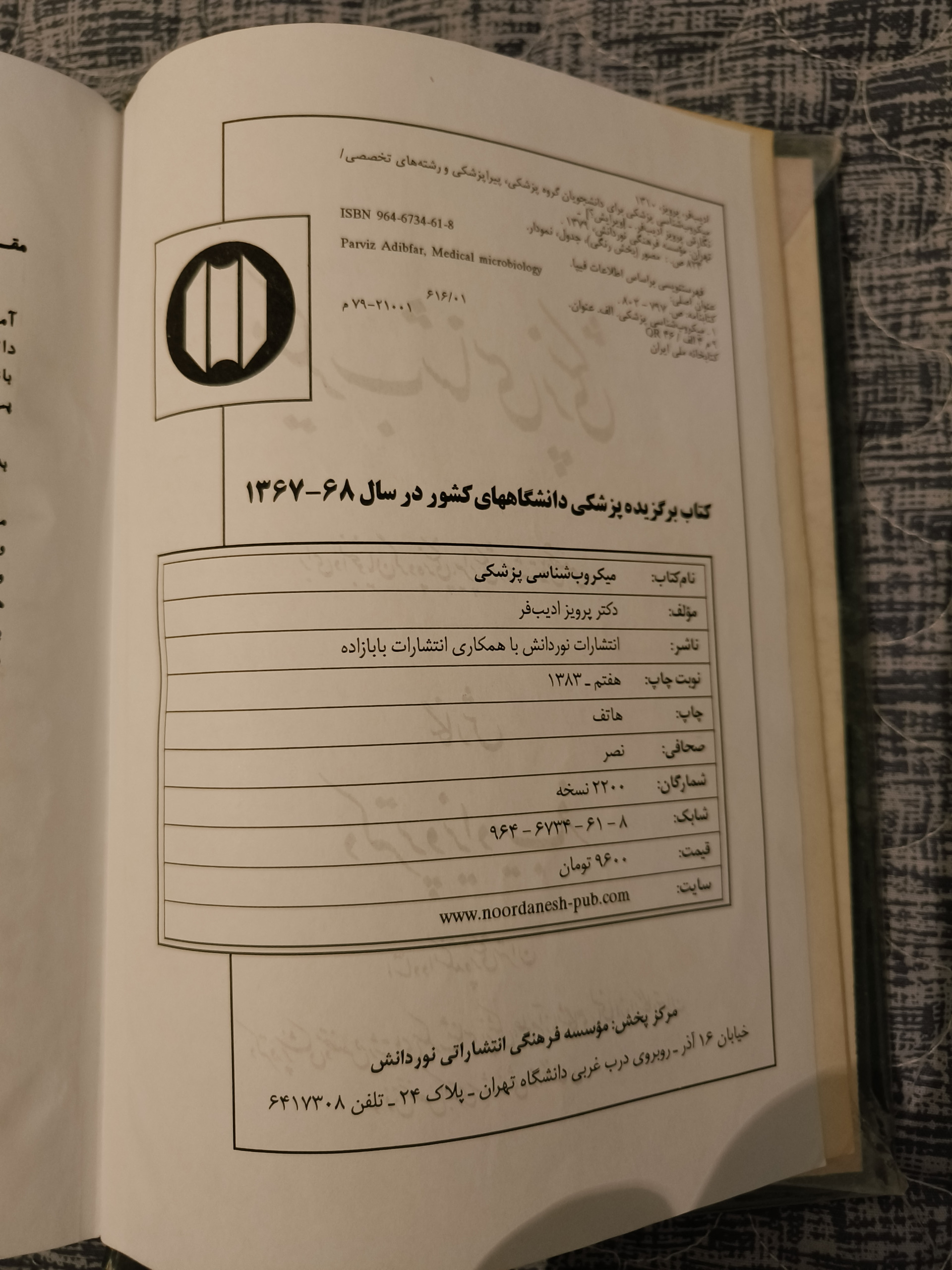 کتاب میکروب شناسی عباس ادیب فر ، که البته با بیس باکتری شناسی هست . کتاب تقریبا نو هست . سرفصل ها مشخص هست . این کتاب ، بر خلاف میکروب شناسی جاوتز ، به علت تالیفی بودن و نه ترجمه بودن ، بیانی قابل فهم دارد . سرفصل ها کاملا مشخص هست و برای دانشجویان رشته میکروب شناسی ، و البته باکتری شناسی ، مفید خواهد بود . رشته های علوم آزمایشگاهی و پزشکی در مرحله علوم پایه و رشته های میکروب شناسی ، می توانند از این کتاب استفاده کنند . تعداد صفحات 802 صحفه هست .