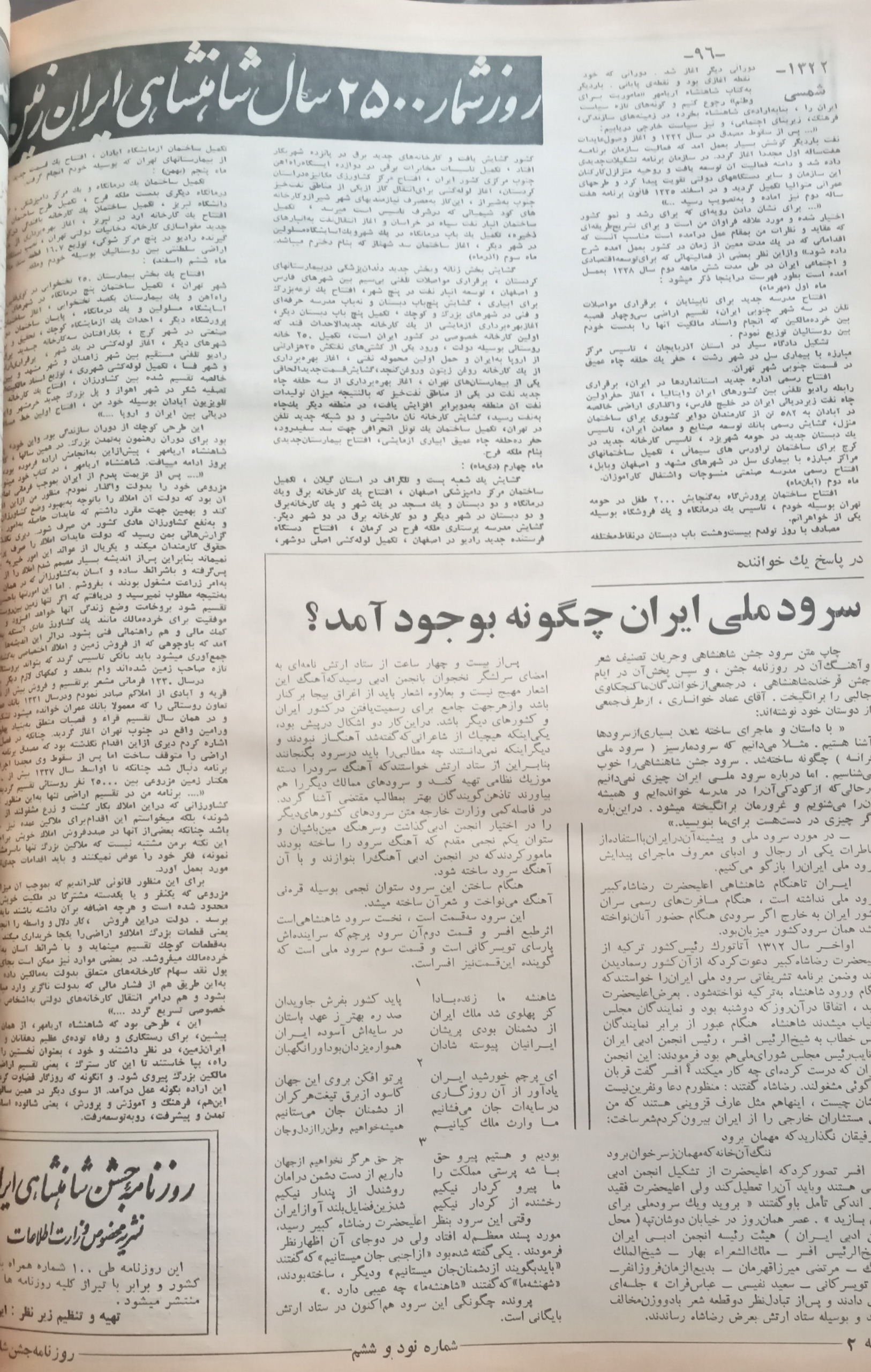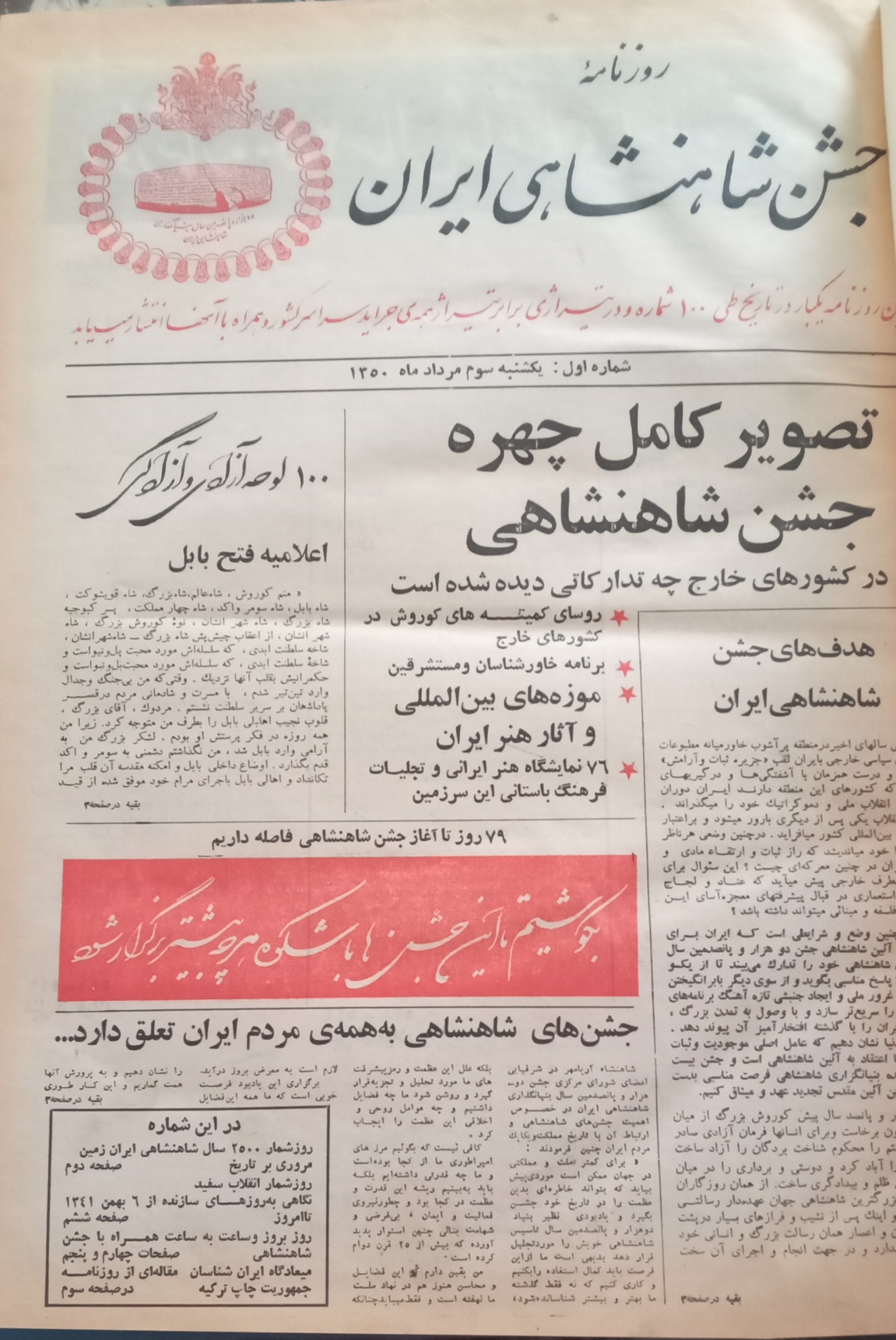 حاوی گزارشها، تصاویر و مطالب تاریخی از جشن تخت جمشید، مهمانان خارجی، و مراسم رسمی آن دوران.