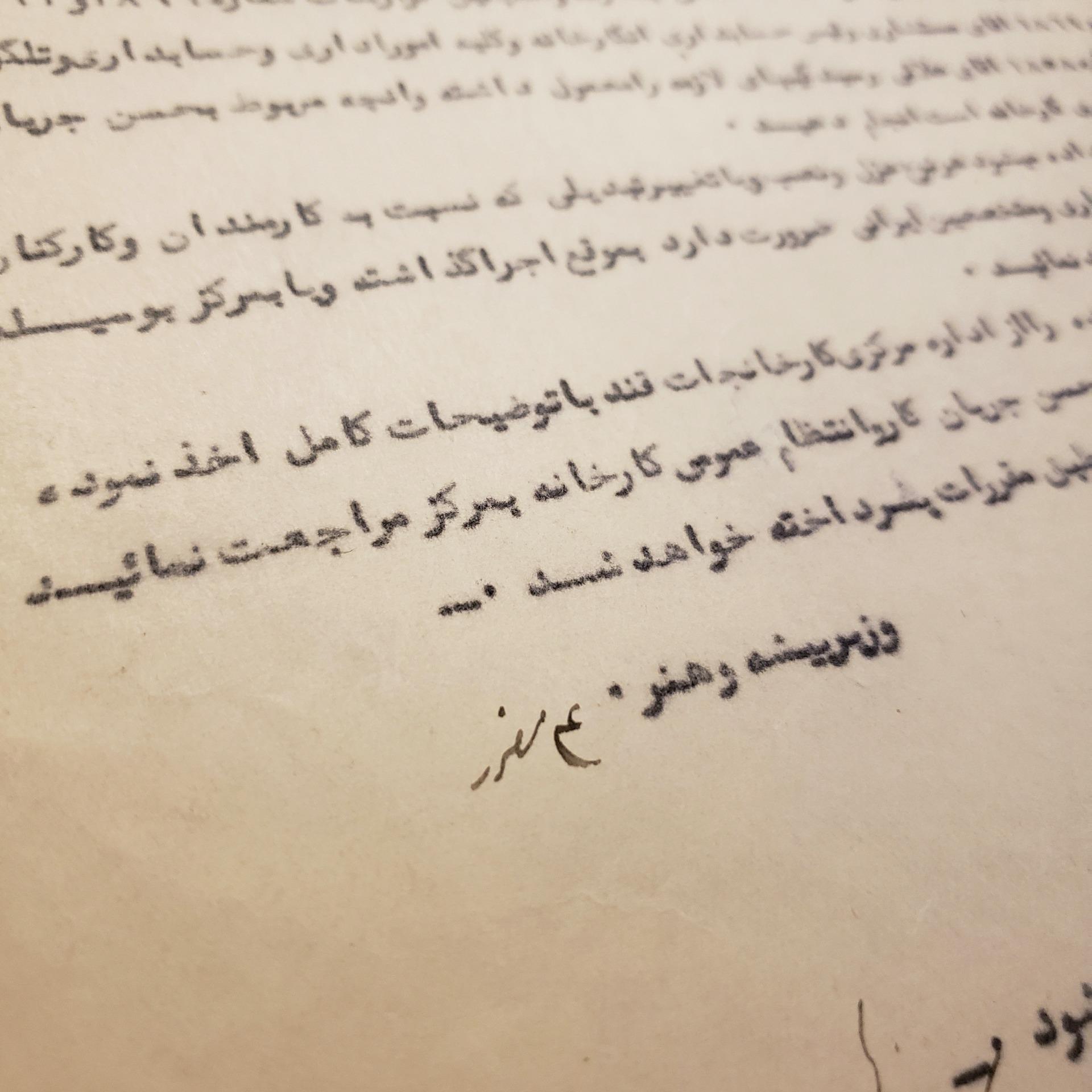 امضا رجبعلی منصور بر سربرگ وزارت صنایع