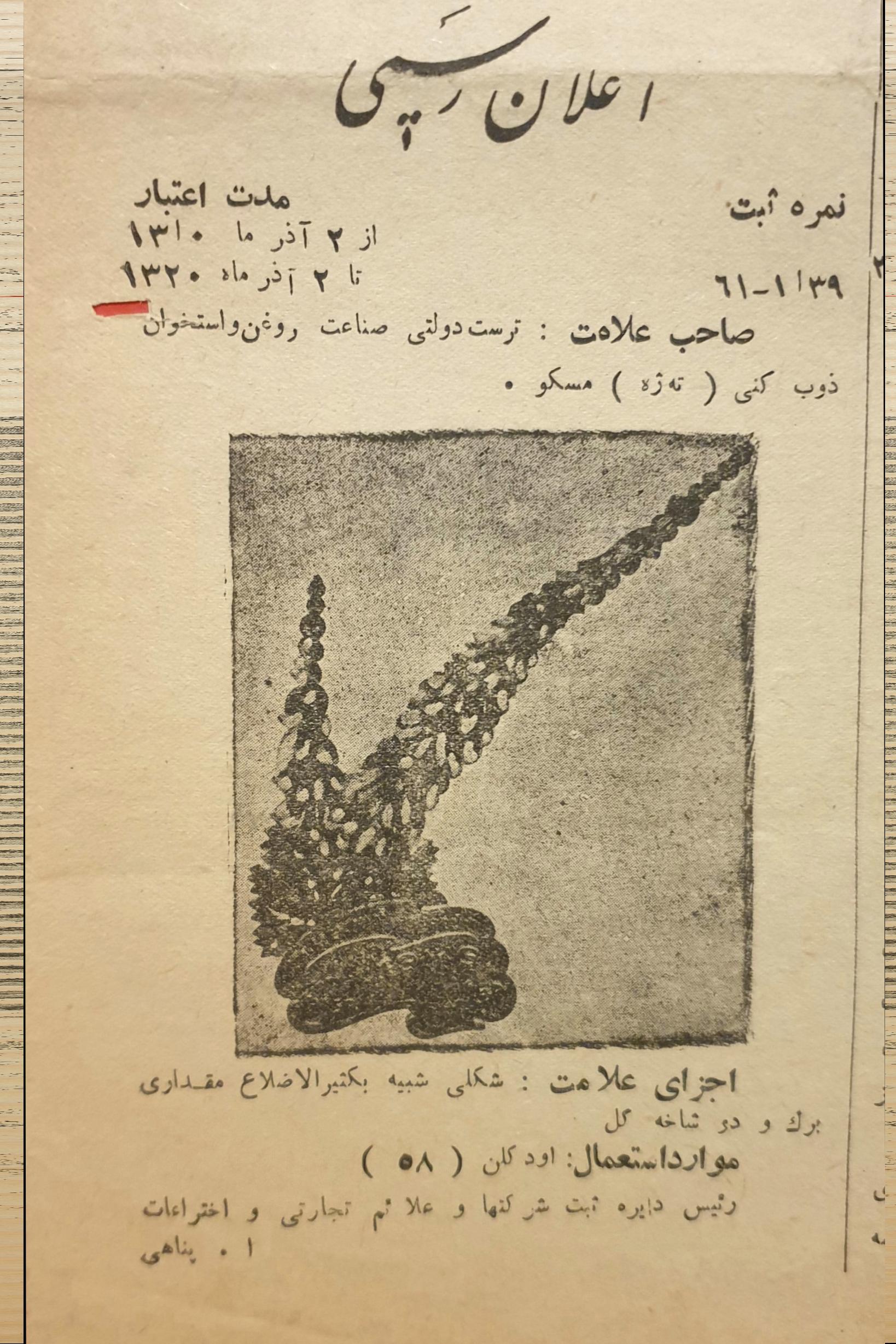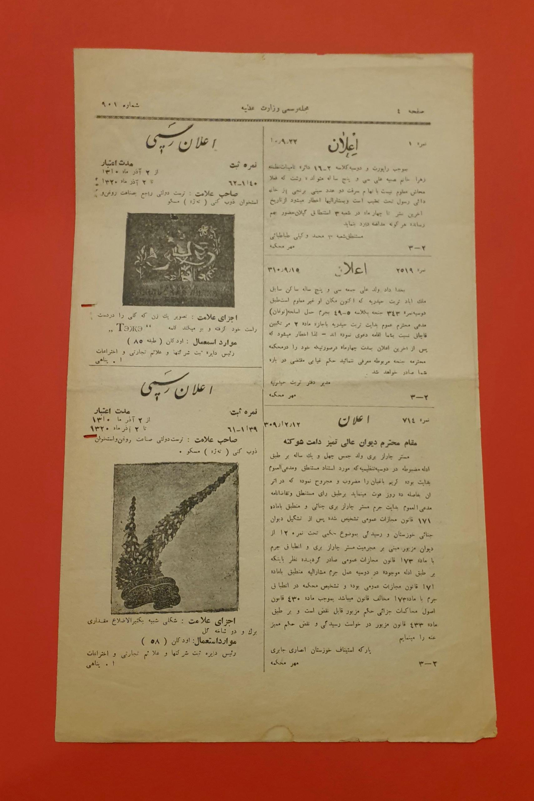 دو اعلان رسمی ثبت برند که از اولین ثبت برندها در روزنامه رسمی میباشند.
