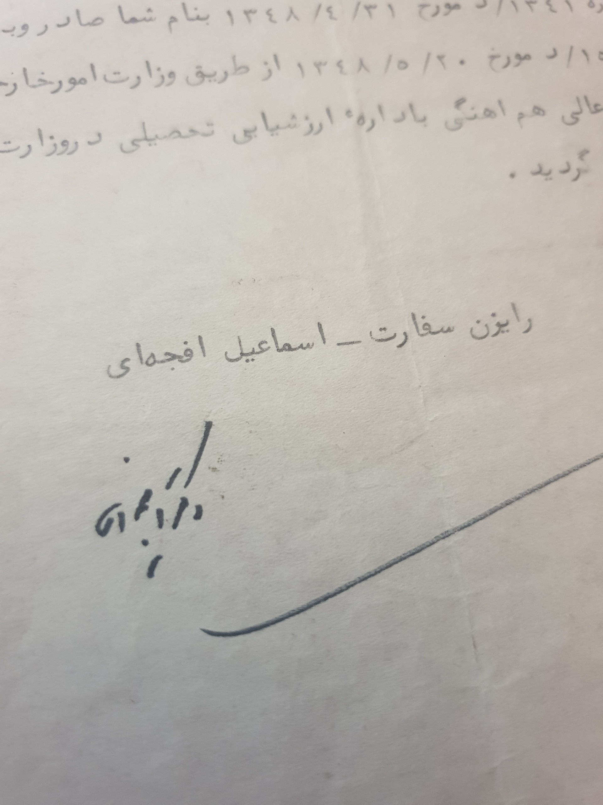 امضا اسماعیل افجه ای بر سربرگ سفارت