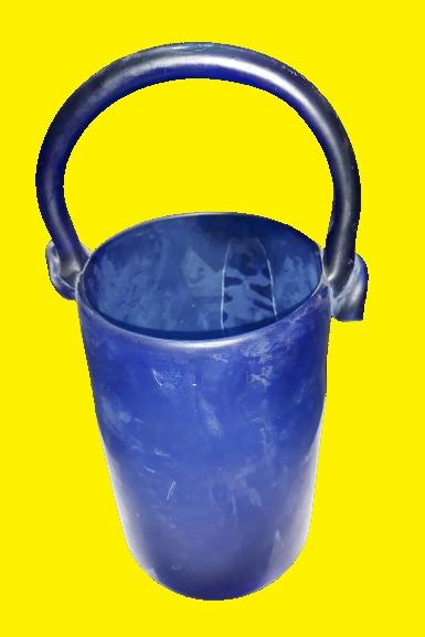 ظرف شیشه ای زیبا و خاص به رنگ لاجوردی تیره، ساخته شده به صورت دست ساز (دمیده) با دسته ی یک تکه.