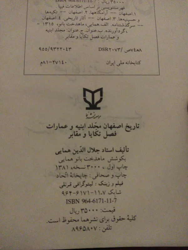کتاب دست دوم میباشد صفحه آخر کتاب دو عدد مهر خوردگی دارد که معدوم شده است