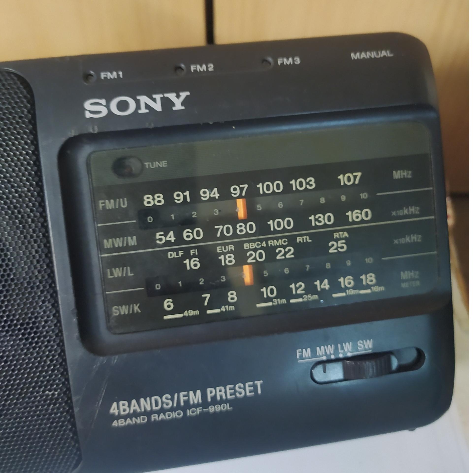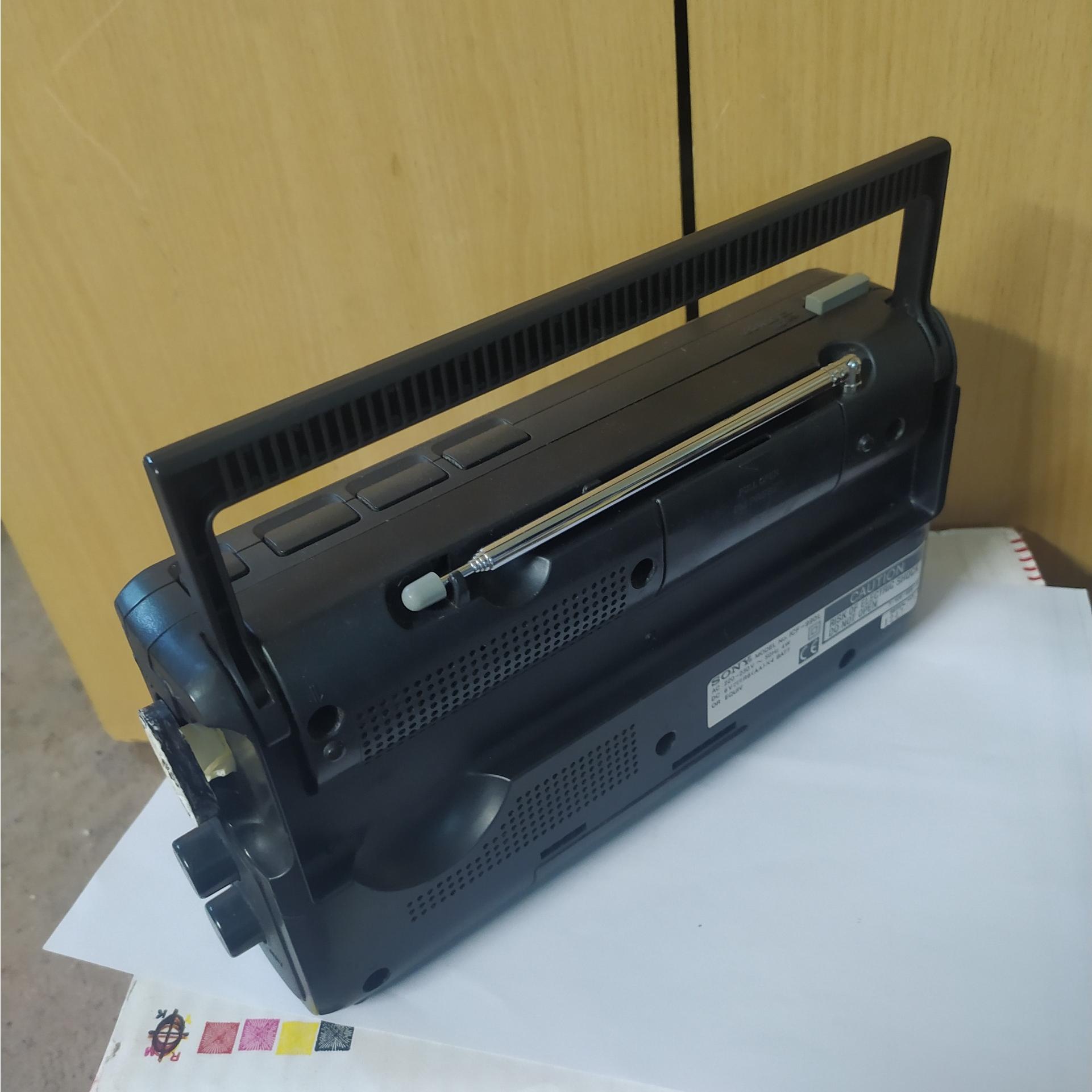 رادیو سونی 4 باند و گیرندگی در تمام باندها عالی و شفاف. دارای حافظه برای ذخیره ایستگاههای رادیویی اف ام. سر کلید تیونر فابریک نیست (عکس سوم). کارکرد با چهار باتری قلمی. برقی هم بوده که فعلا فعال نیست. فقط با باتری قلمی کار میکند.