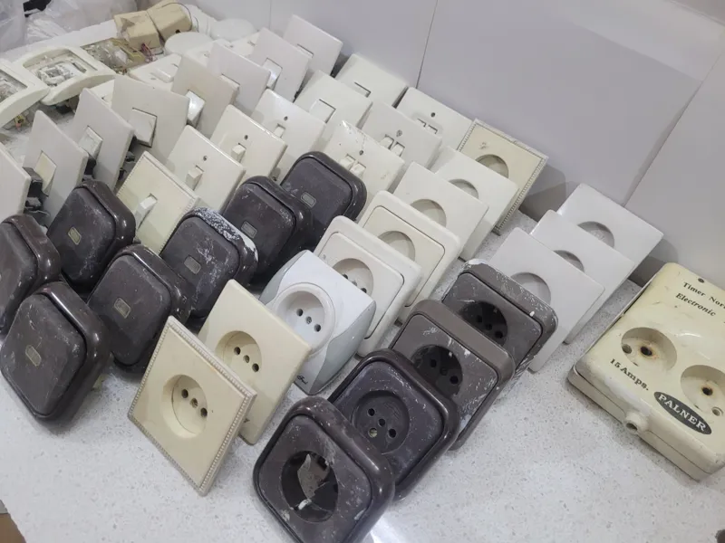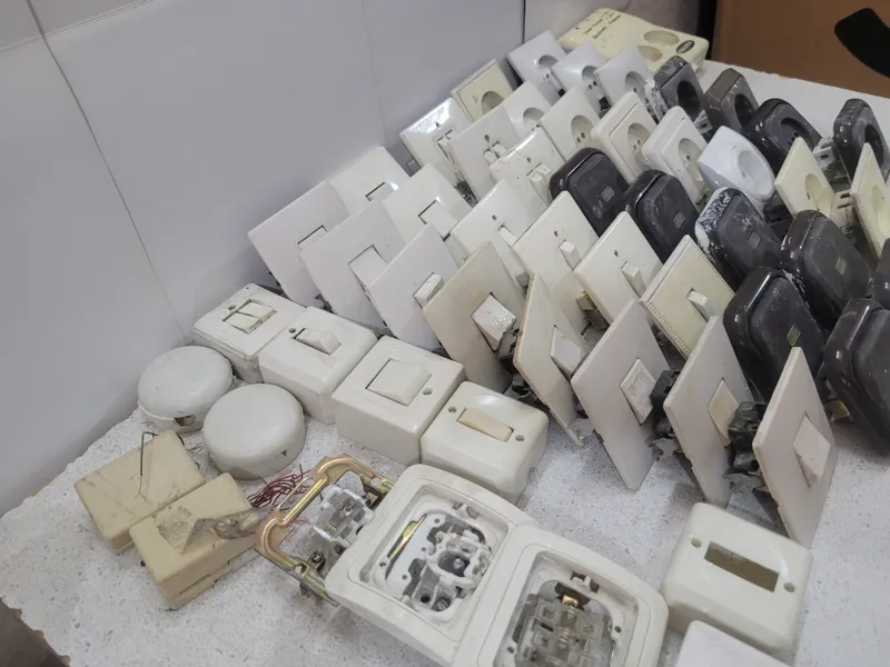 کلید تک 21 عدد کلید دو پل 3 عدد پریز 13 عدد پریز تلفن 2 عدد روکار تک پل 3عدد روکار دوپل یک عدد جعبه تقسیم 2 عدد یک عدد فیوز 25 آمپر این موارد سالم هستند بقیه رایگان گذاشته شده