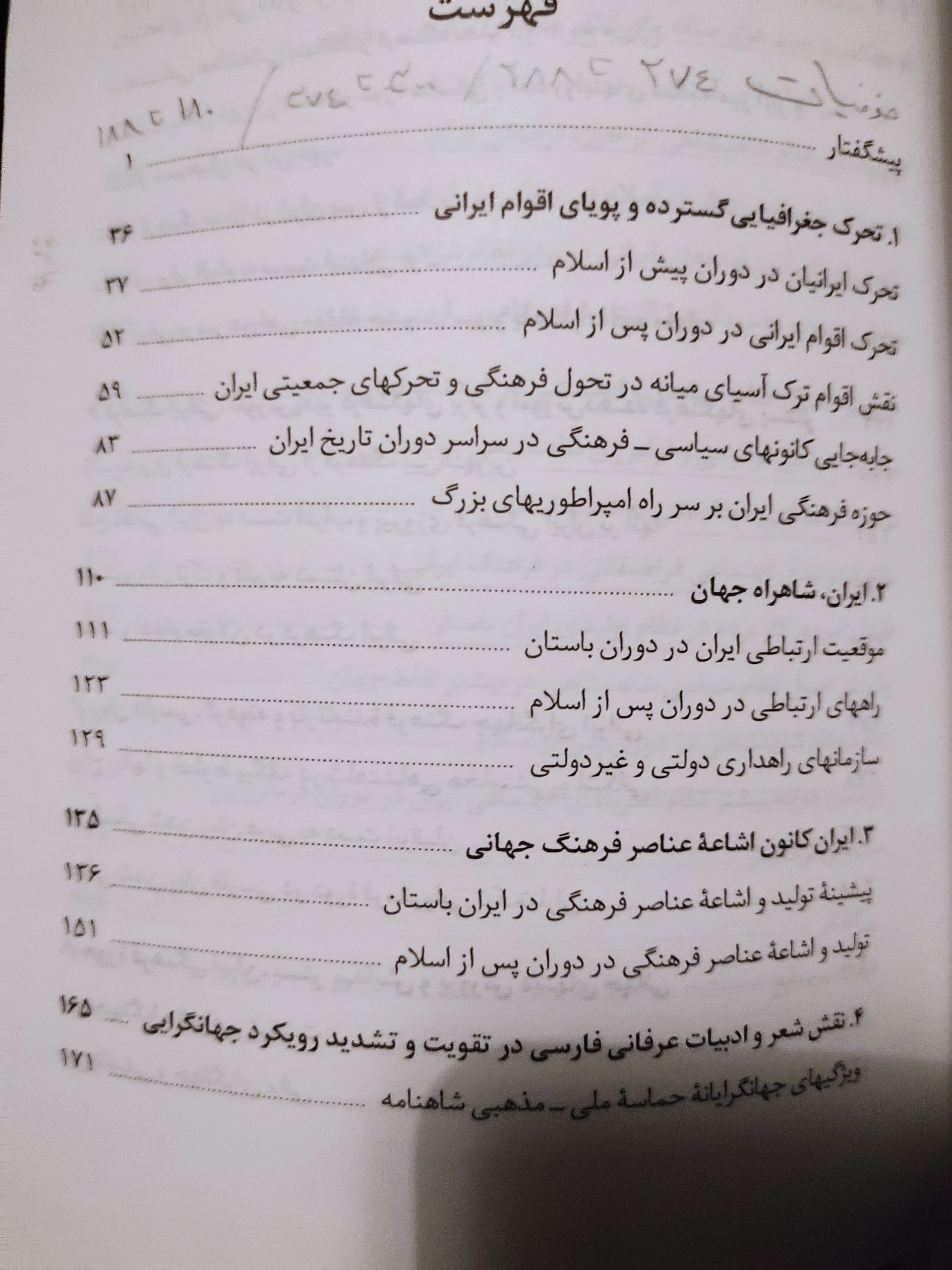 تاریخ ایران مبسوط و مستدل شود و در این زمینه شواهد موجود در زبان ایرانیان، دینهای اقوام ایرانی در طول تاریخ، ساختار سیاسی جوامع ایرانی، ادبیات و به ویژه شعر فارسی، هنرهای ظریفه و معماری بررسی و تحلیل شده اند و رگه ی جهان گرا و جهان پذیر نیرومند این فرهنگ نشان