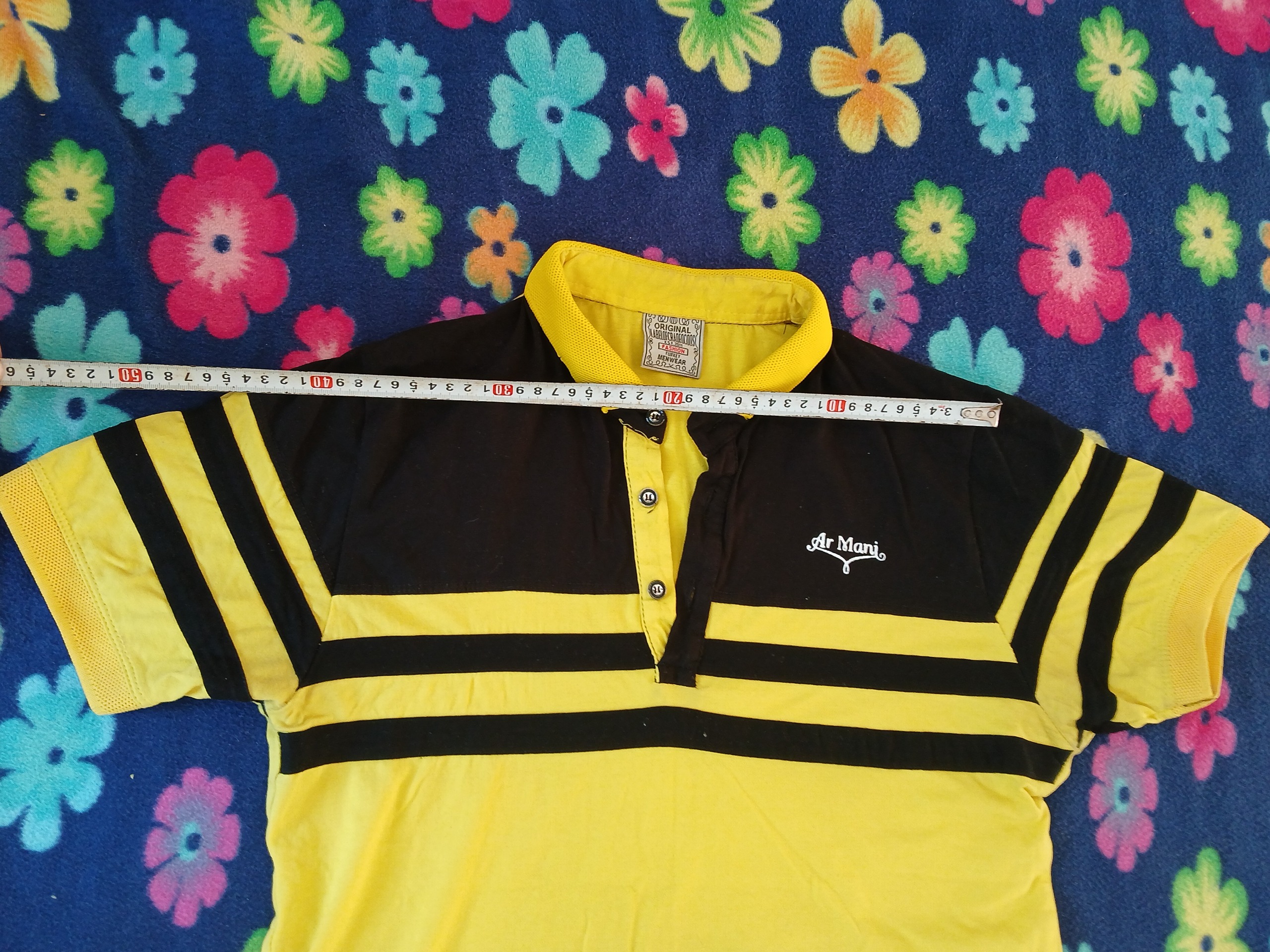 تیشرت زرد رنگ اندازه بلندی و سرشانه تو عکس هست.