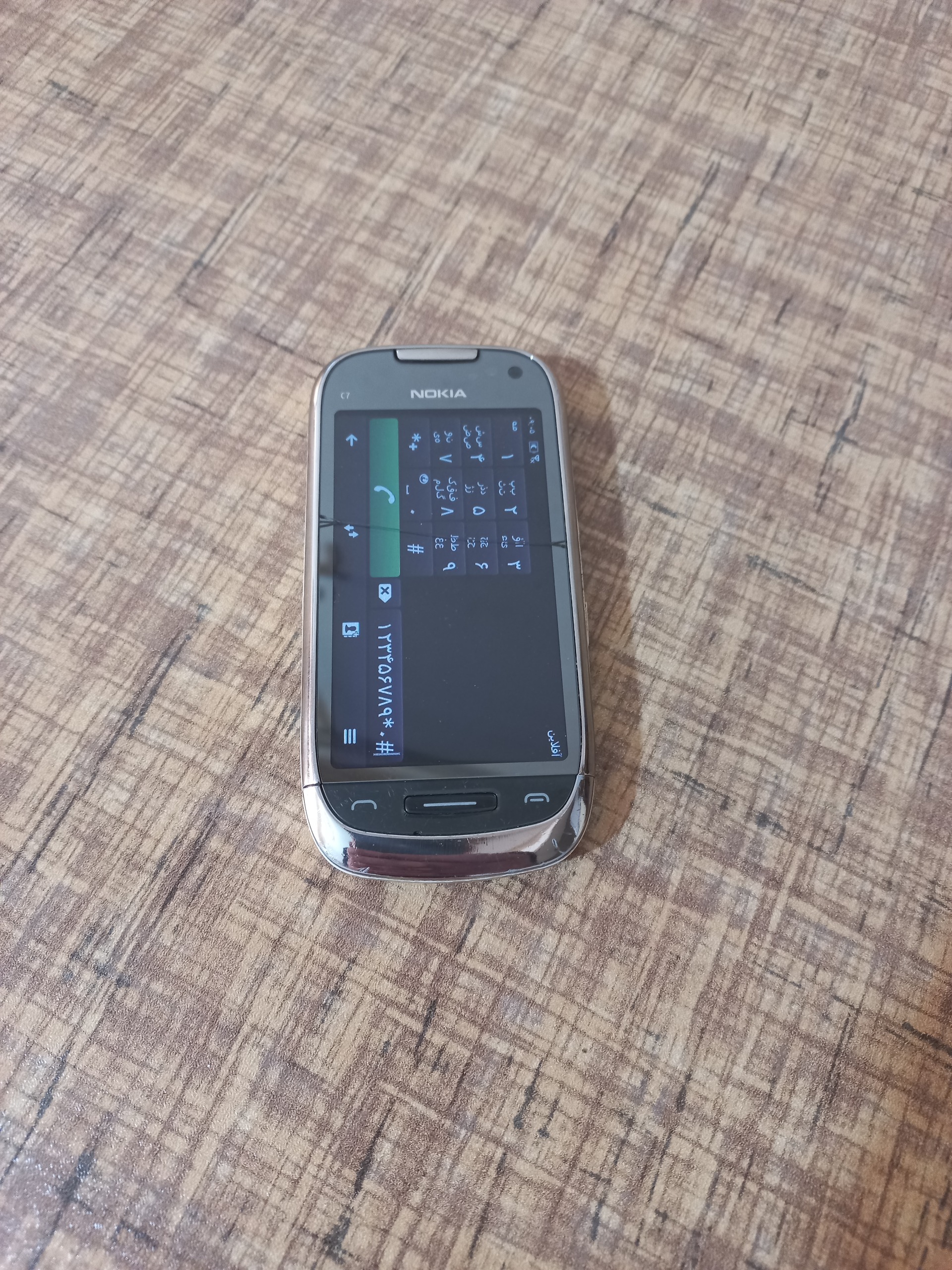 سلام گوشی نوکیا مدل c7 روشن سالم صدای رفت وبرگشت عالی گوشی دست دوم میباشد ریجسترشده باتری داره تاچش ازوسط شکسگی داره ولی کارمیکنه بدون لوازم فاقدکارتن