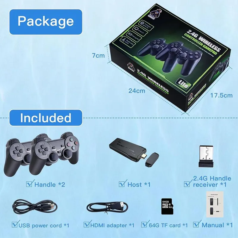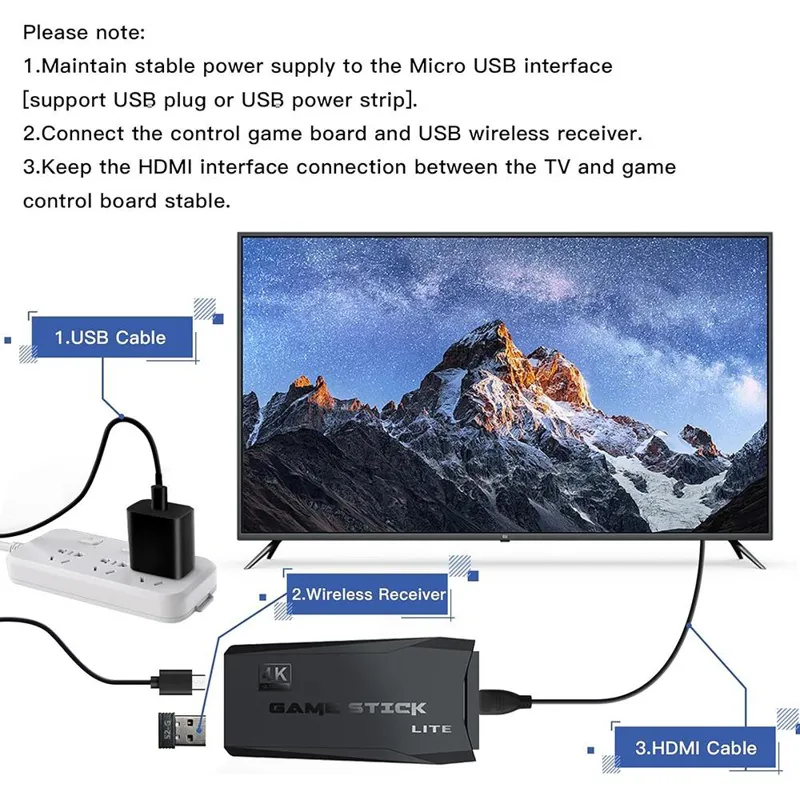 فقط کنسول بازی ویدیویی یکپارچه سازی با سیستمعامل را روشن کنید و آن را به پورت HDMI تلویزیون خود وصل کنید، تا استیک به طور خودکار شروع به کار کند. لطفا تلویزیون را روی کانال HDMI مربوطه تنظیم کنید و زمان بازی شاد خود را شروع کنید.