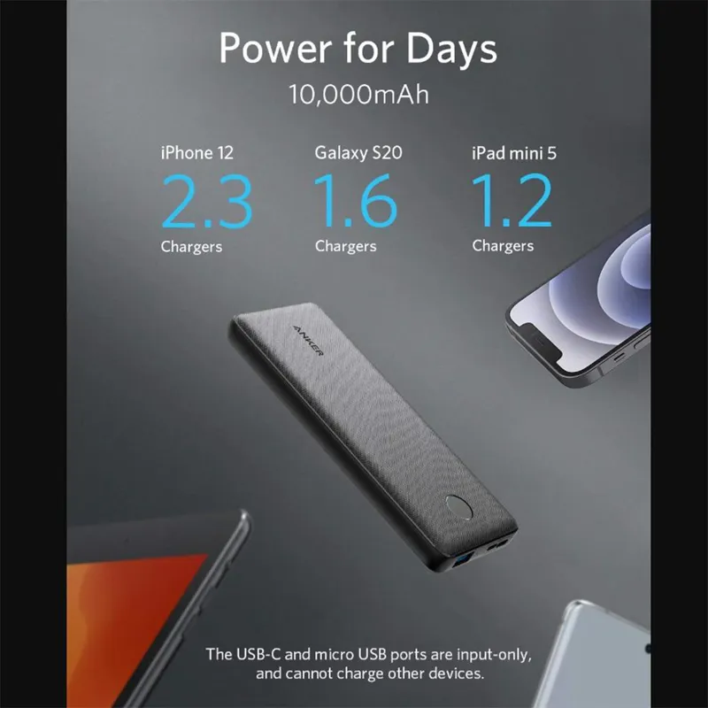 اندازه باریک، قدرت بزرگ: یکی از باریک ترین و سبک ترین شارژرهای قابل حمل 1000 میلی آمپر ساعتی موجود در بازار. شارژ 2.25 برای iPhone 12، 1.6 شارژ برای Galaxy S20 و 1.2 شارژ برای iPad mini 5 میکند. دو درگاه ورودی ممکن است استفاده نشوند. پورت ورودی USB-C هیچ عملکردی