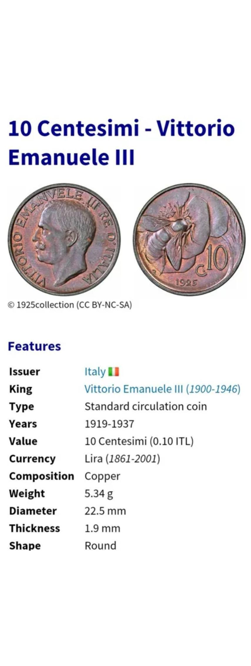سکه 10 سنتیمی امانوئل سوم ایتالیا 1924