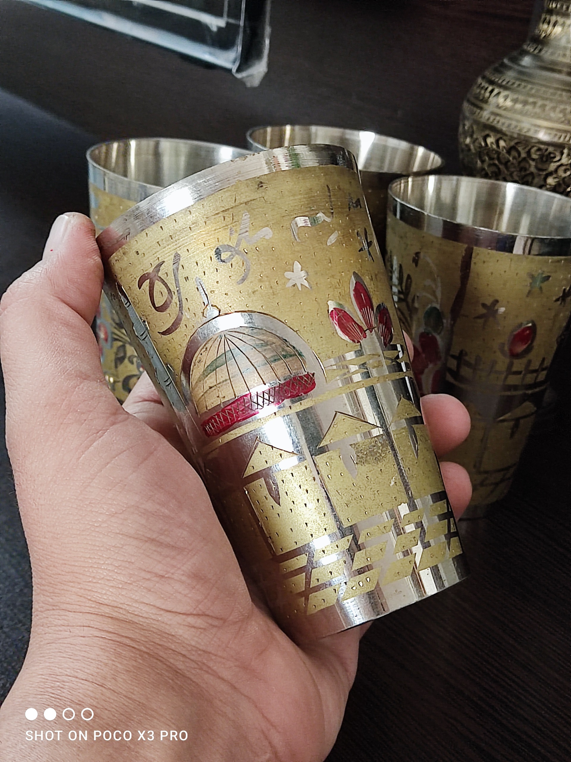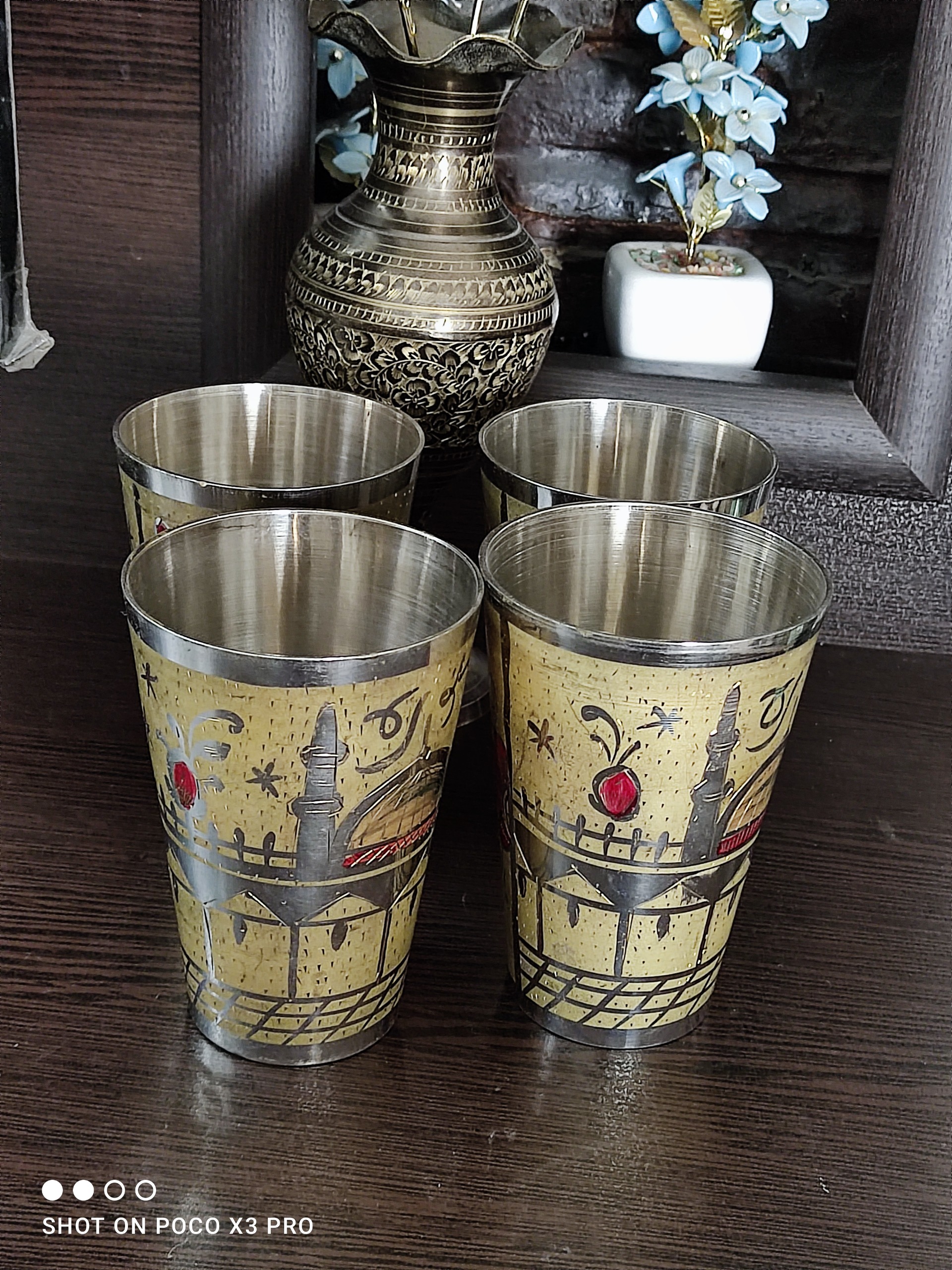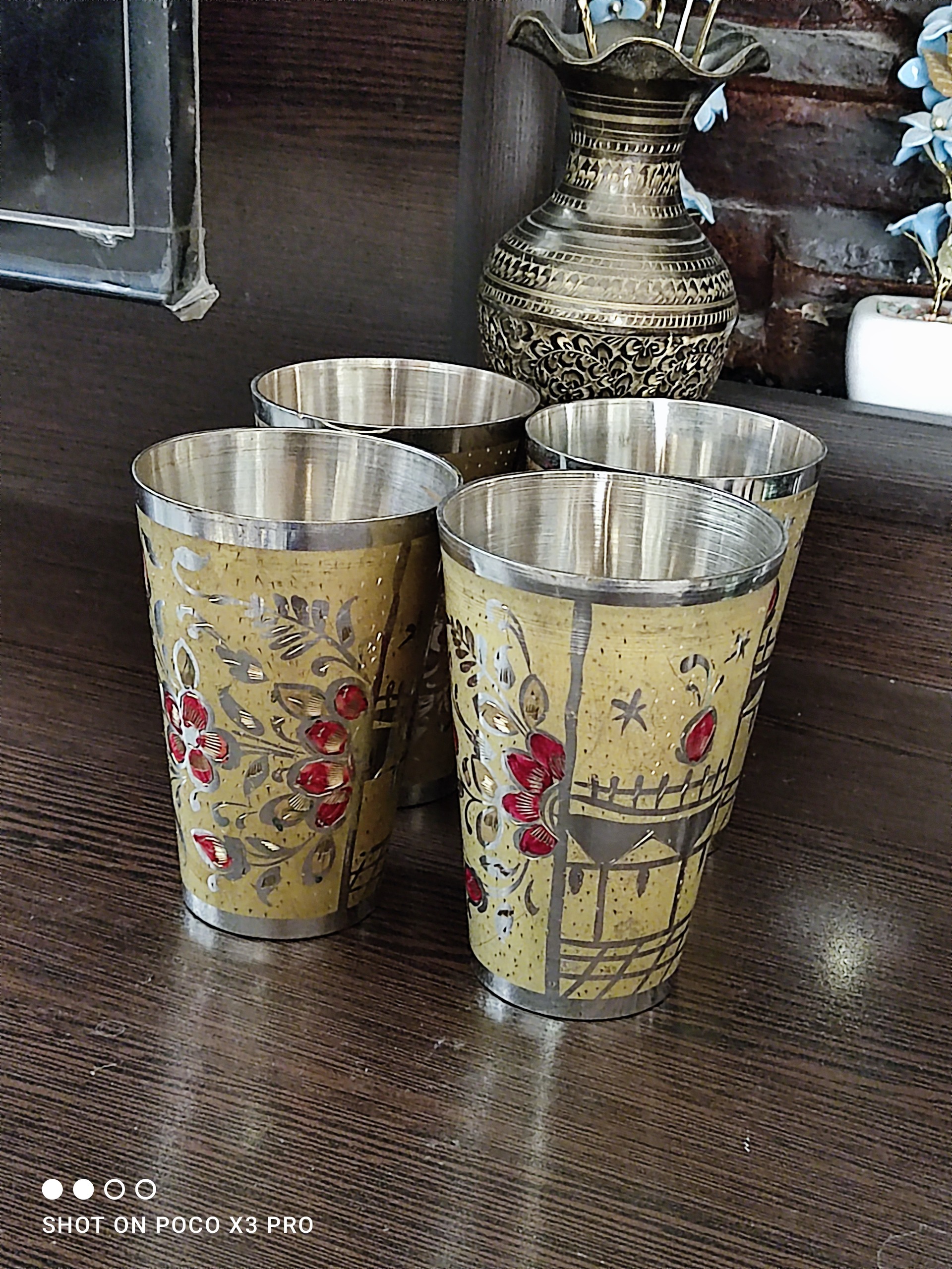 چهار عدد لیوان برنجی قدیمی مطابق تصاویر محکم و ضخیم و سنکین رنگامیزی و قلمکاریش کار دسته استفاده نشده آک آک قیمت برای همشه