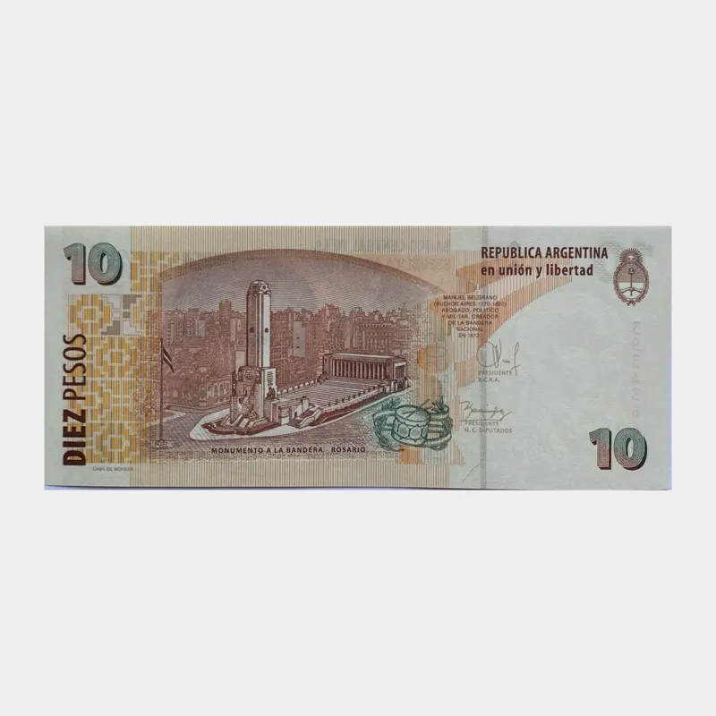 اسکناس آرژانتین با تصویر مانوئل بلگرانو رهبر نظامی آرژانتین که جنگهای استقلال این کشور شرکت داشت و همچنین طراح پرچم آرژانتین است.
