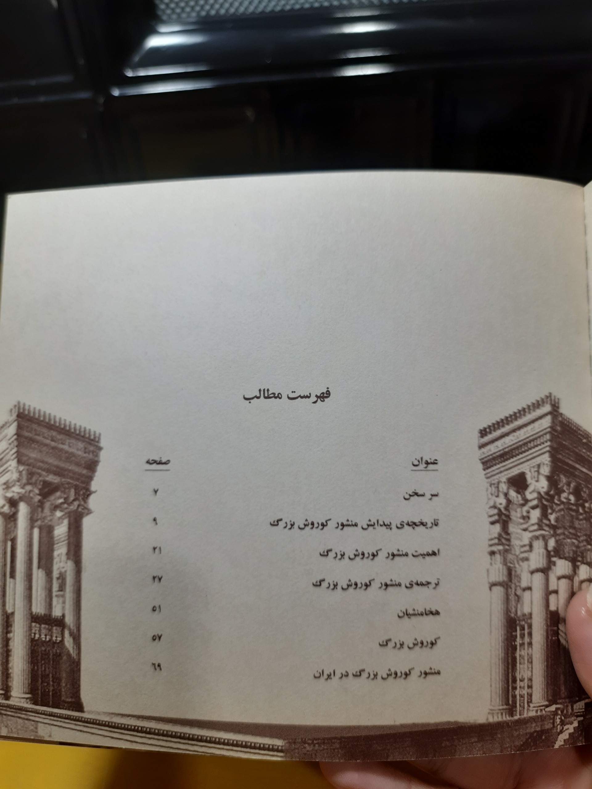 موضوع کتاب منشور کوروش هخامنشی چاپ اول سال90. سایز خشتی جلد رقعی:، شرح زندگی و افکار کوروش کبیر و ترجمة متن منشور حقوق بشر وی است. این کتاب، تلاشی است در راستای معرفی کوروش هخامنشی و بررسی چگونگی پیدایش منشور وی. از جمله مباحث مورد توجه در کتاب، میتوان به این عناوین اشاره کرد: «تاریخچة پیدایش منشور کوروش بزرگ»؛ «اهمیت منشور کوروش بزرگ»؛ «ترجمة منشور کوروش بزرگ»؛ «هخامنشیان»؛ «کوروش بزرگ و منشور کوروش بزرگ در ایران