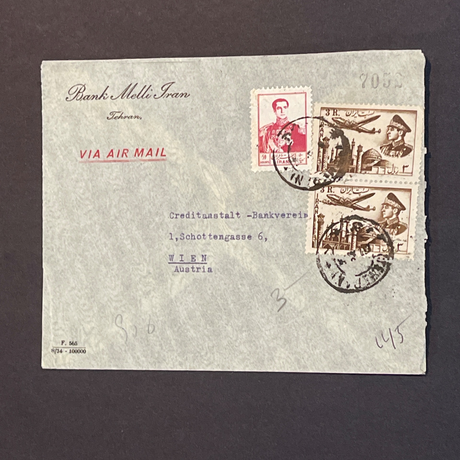 پاکت بانک ملی تهران به اتریش با تمبرهای پست هوایی و سری ششم