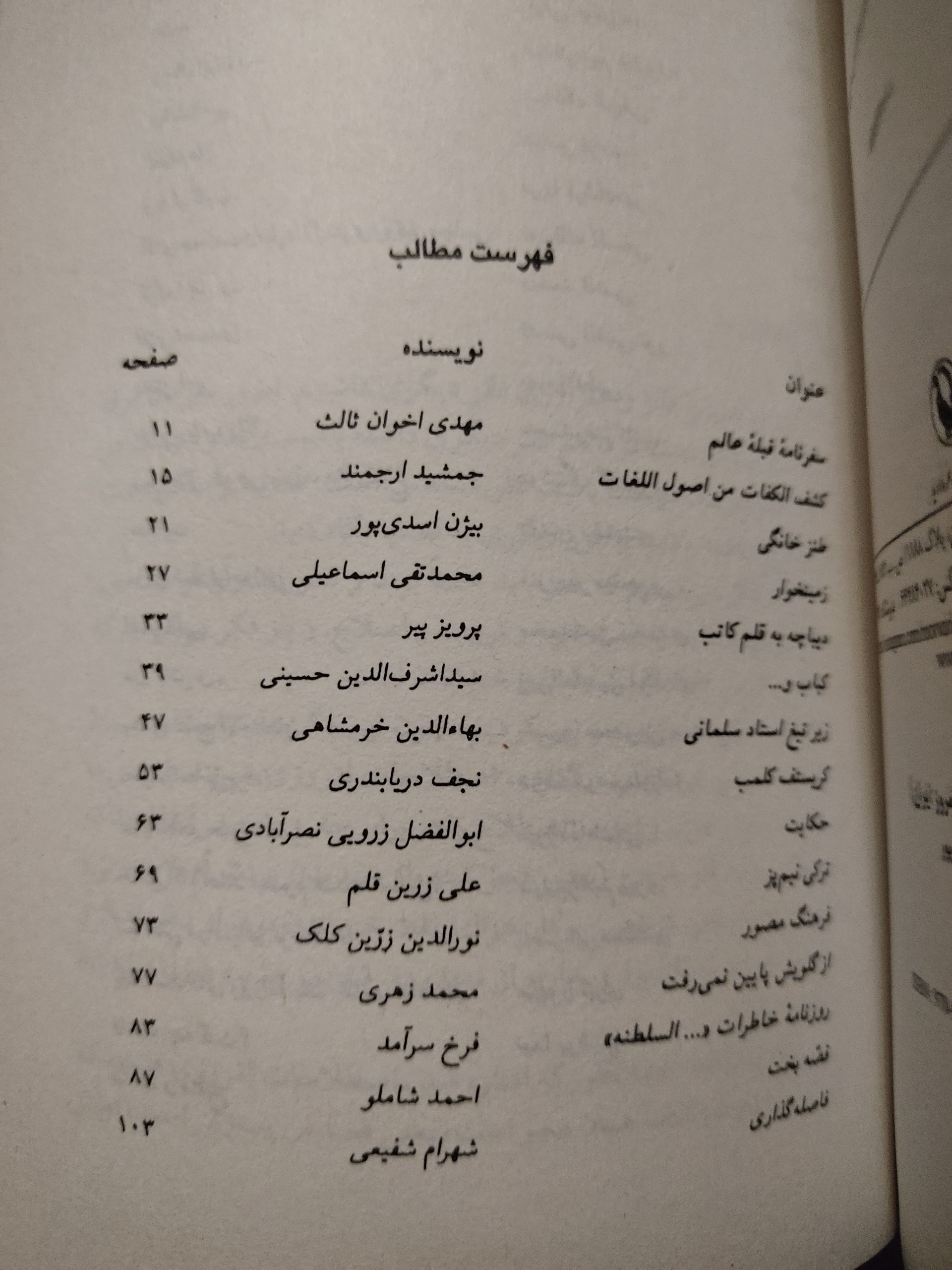 است : سفرنامه قبله عالم / مهدی اخوان ثالث ، کشفالکفات من اصول اللغات / جمشید ارجمند ، طنز خانگی / بیژن اسدیپور ، کباب / سیداشرفالدین حسینی، زیر تیغ استاد لمانی / بهاالدین خرمشاهی، کریستف کلمب / نجف دریابندری، قصه بخت / احمد شاملو ، رجال ایران / عبدالرحیم طالبوف