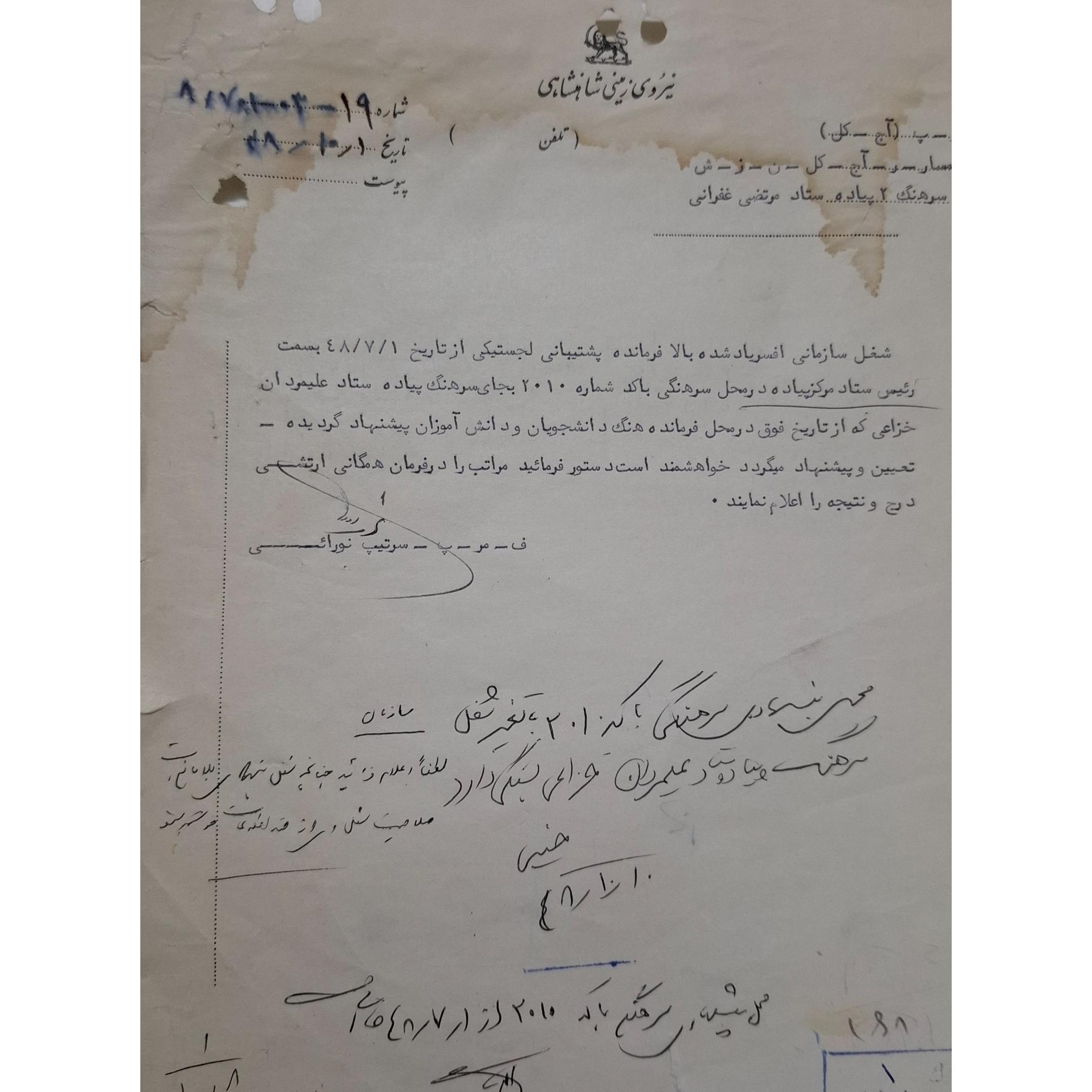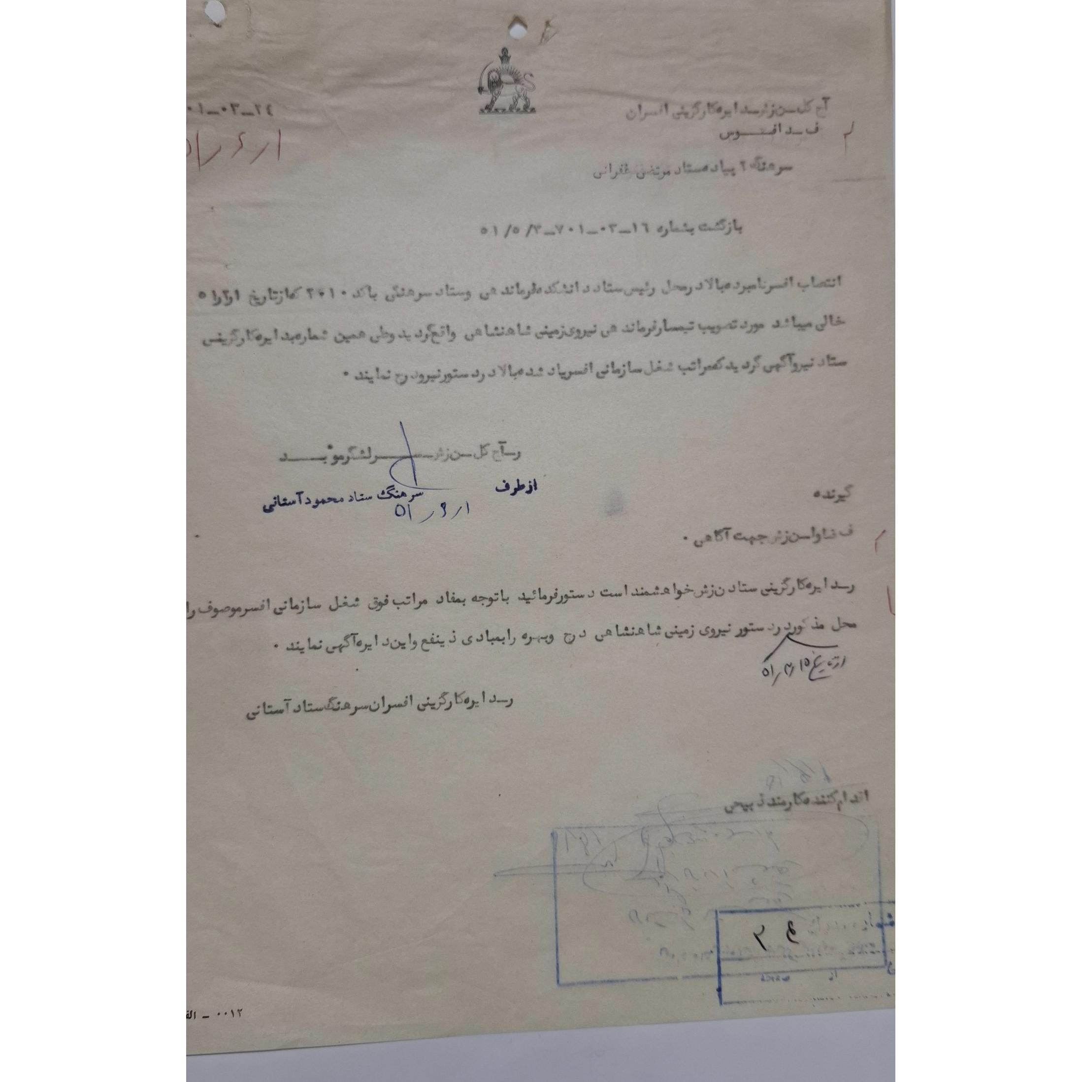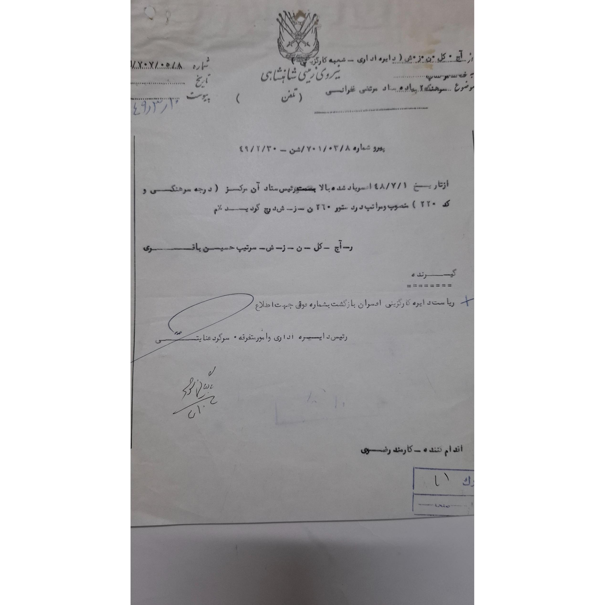 3 برگ نامه دایره اداری شعبه کارگزینی نیروی زمینی شاهنشاهی و نامه اداره کارگزینی افسران مربوط به سرهنگ 2 پیاده ستاد مرتضی غفرانی