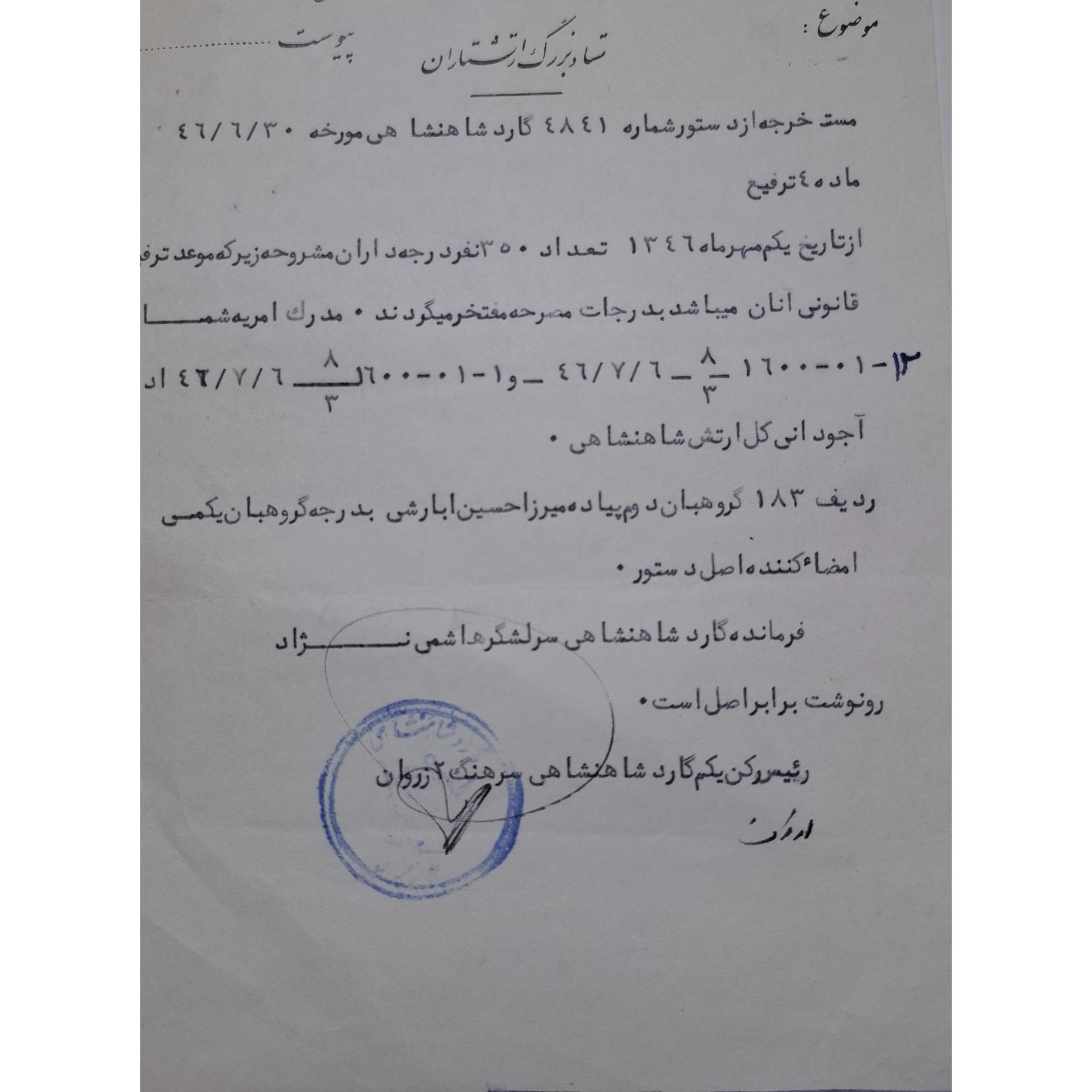 نامه مستخرجه ستاد بزرگ ارتش تاران مربوط به گروهبان دوم پیاده میرزا حسین ابارشی با مهر و امضای گارد شاهنشاهی