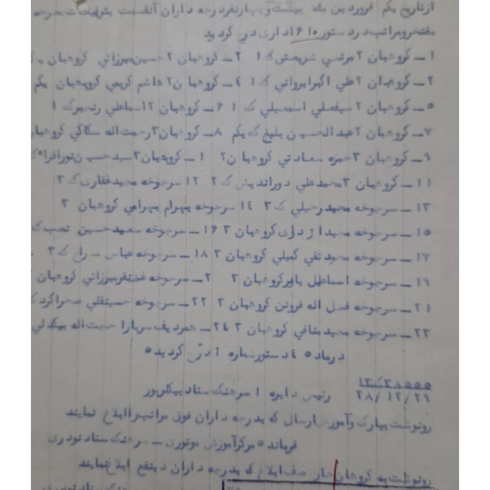 نامه فرماندهی مرکز آموزشی موتوری مربوط به 24 نفر درجه داران