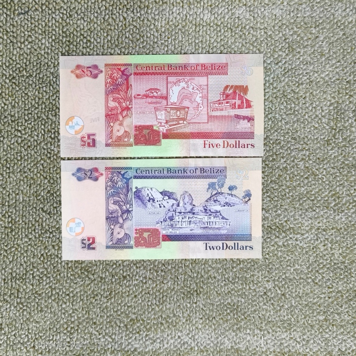 دو اسکناس 2 و 5 دلار بلیز با تصویر میانسالی ملکه الیزابت دوم. قیمت برای هر دو اسکناس با هم است.