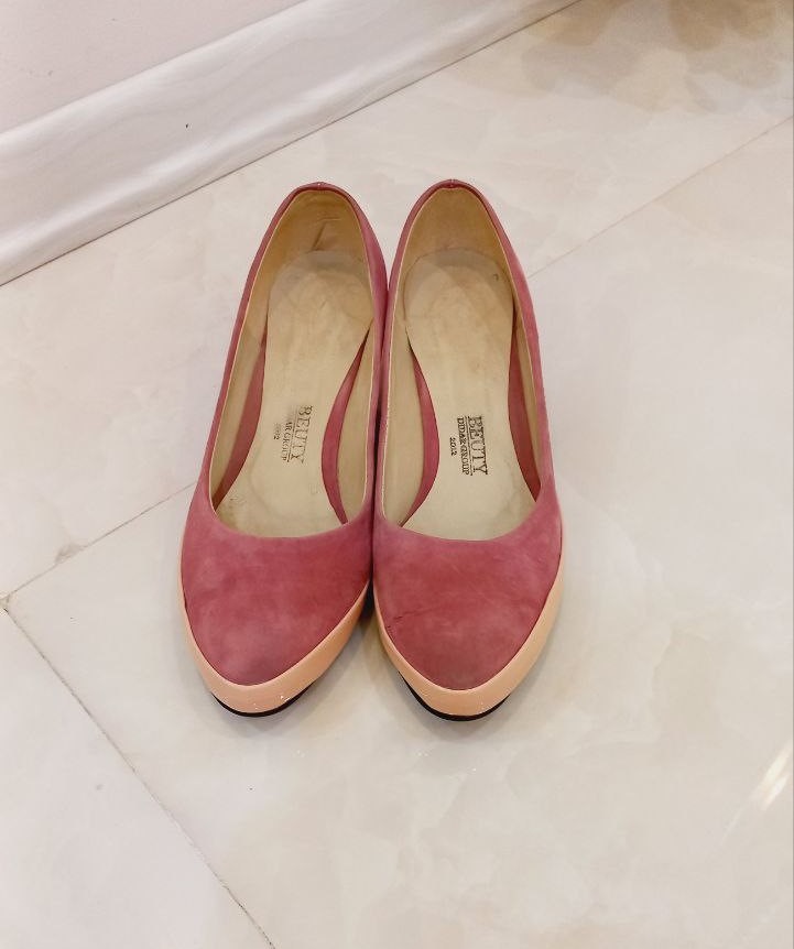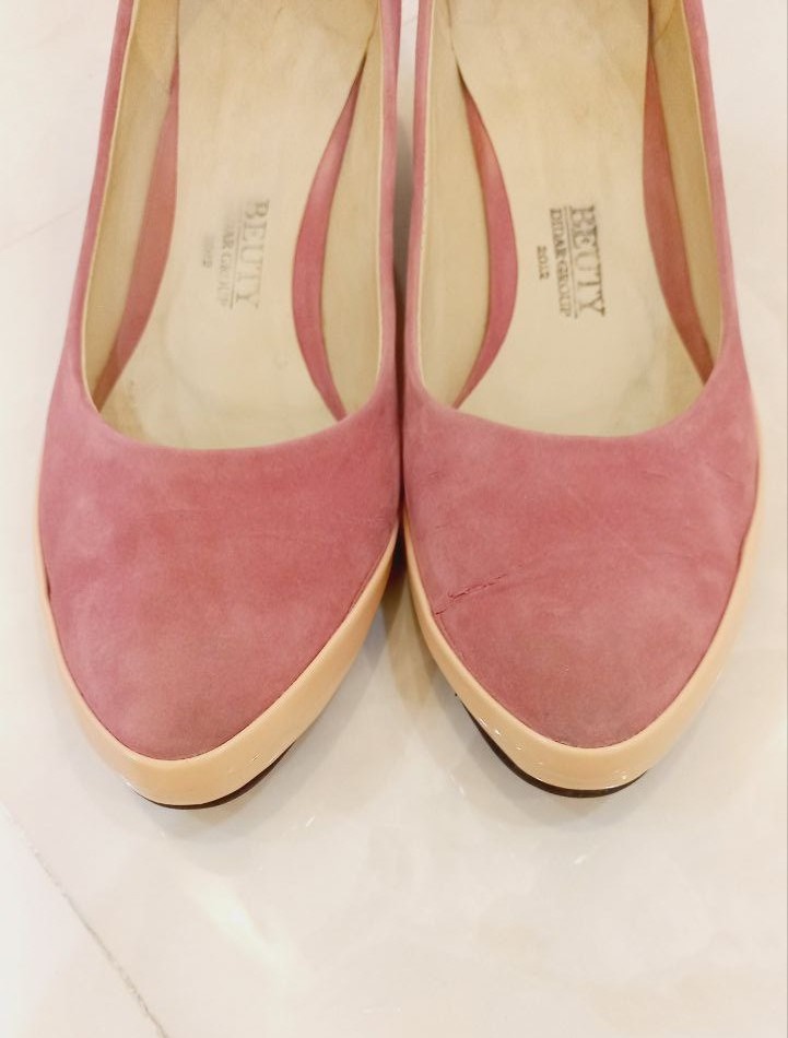 اندازه های کفش صورتی( تصویر اول): سایز کفش 40 هست. کف کفش 26 سانت هست. و 4 سانت پاشنه دارد. برای سایز 39 و 40 مناسب هست. بسیار کفش راحتی هستش. فقط یکبار یک مجلس پوشیدم و داخل کمد بوده در اثر گذر زمان ( مطابق تصوی سوم ) کناره یکی از لنگه کمی جیرش شکسته و کناره های کفش اگر با دست فشار بیاری به سمت داخل جیرش جدا شده که داخل پا و در حالت پوشیده اصلا مشخص نیست ولی این نکات رو برای افراد حساس گفتم