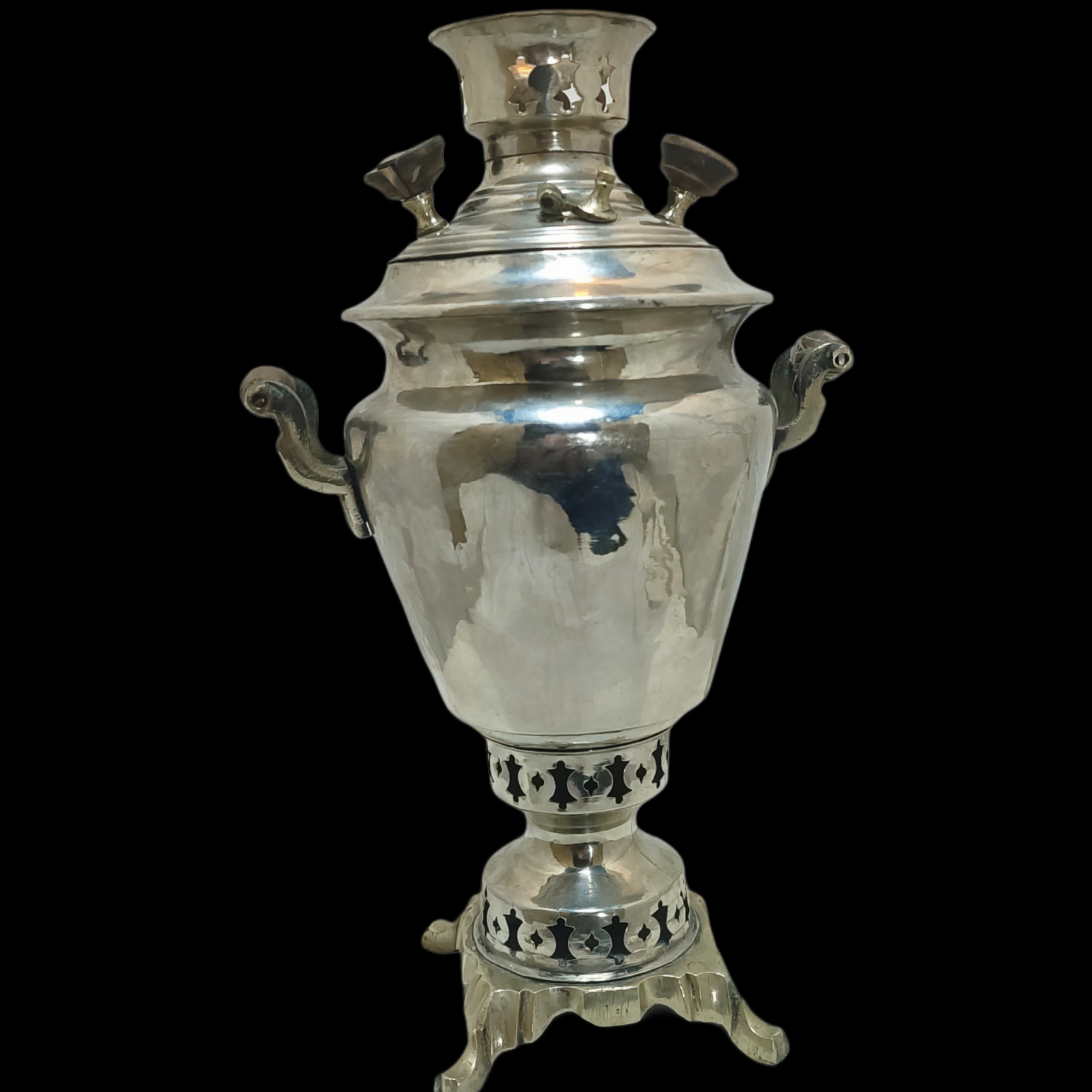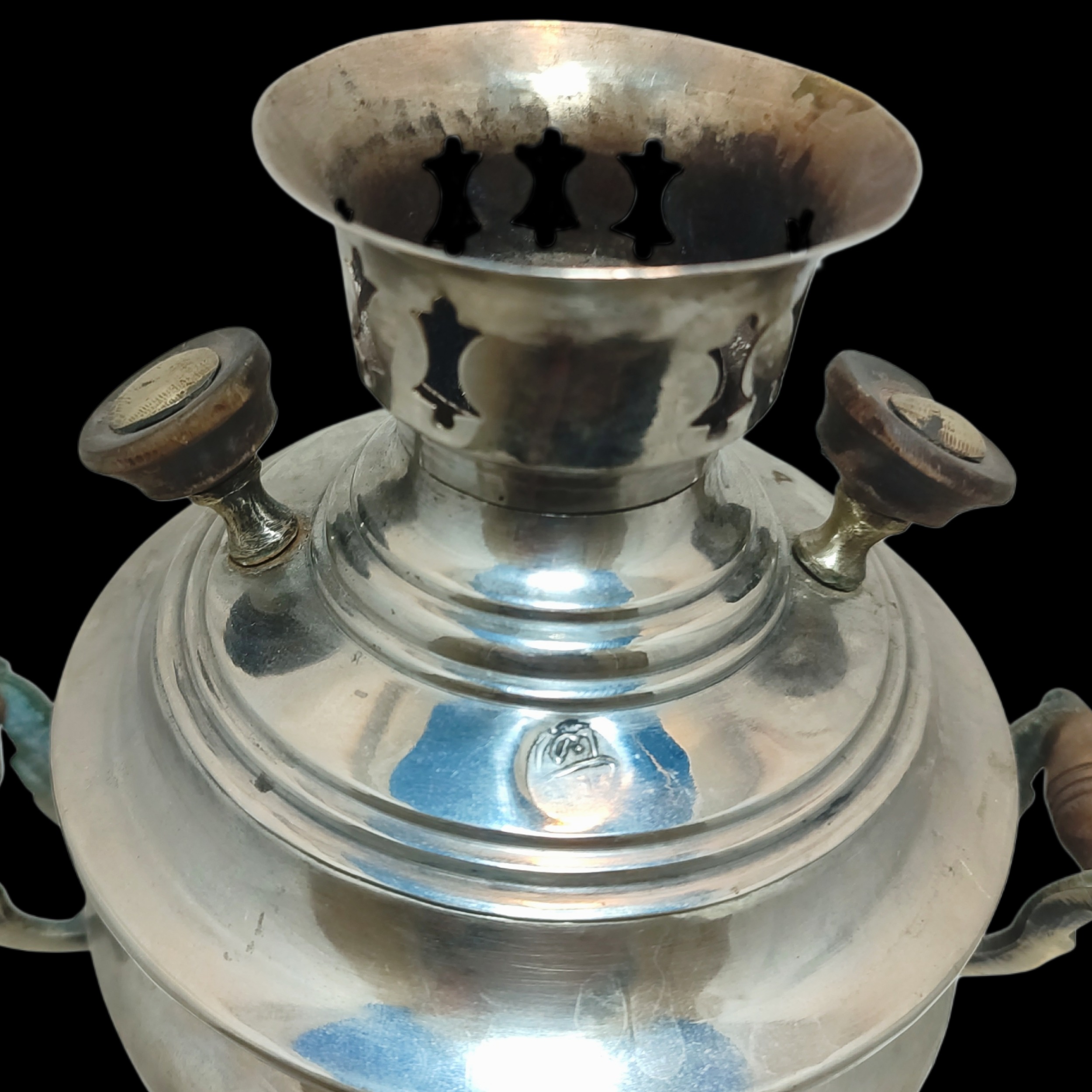 سماور ذغالی قدیمی که جنس آن از فلز ورشو هست و مهر سازنده روی آن حک شده است.