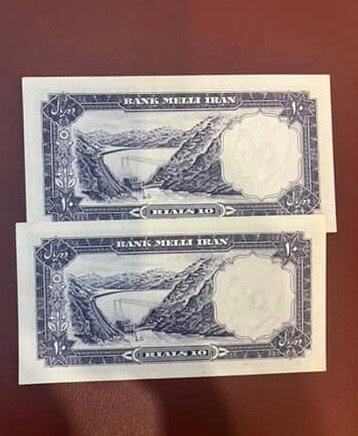 جفت اسکناس 10 ریال 1337 کیفیت : بانکی بدون شتسشو وپرس سری : هفتم سال انتشار: 1337 روی اسکناس : تصویر محمد رضا پهلوی و پشت اسکناس : سد کرج