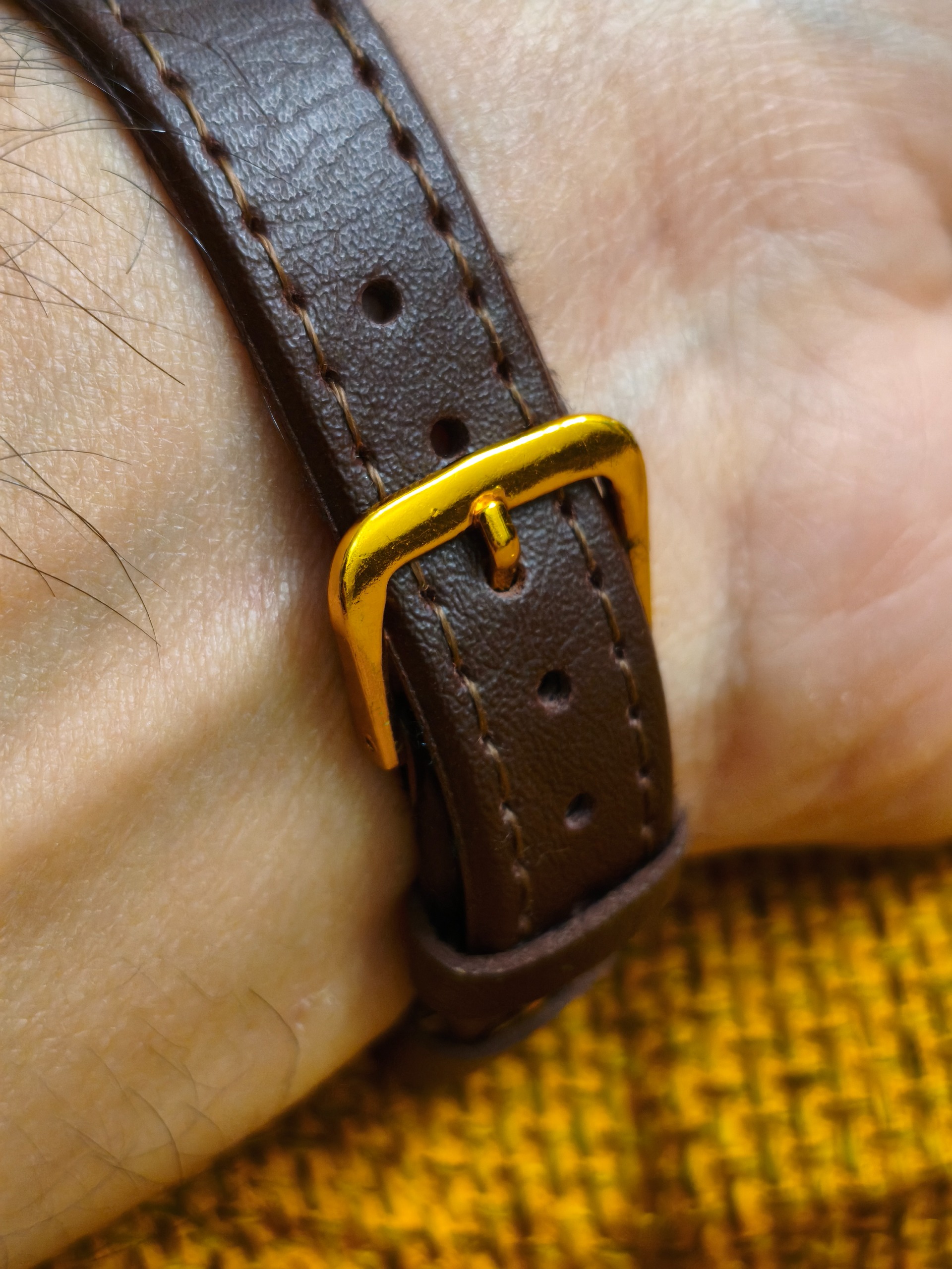 - بند چرمی قهوهای با دوخت ظریف و سگک طلایی کلاسیک، جایگزین با کیفیت خارجی و همساز با فرم کلاسیک بدنه.