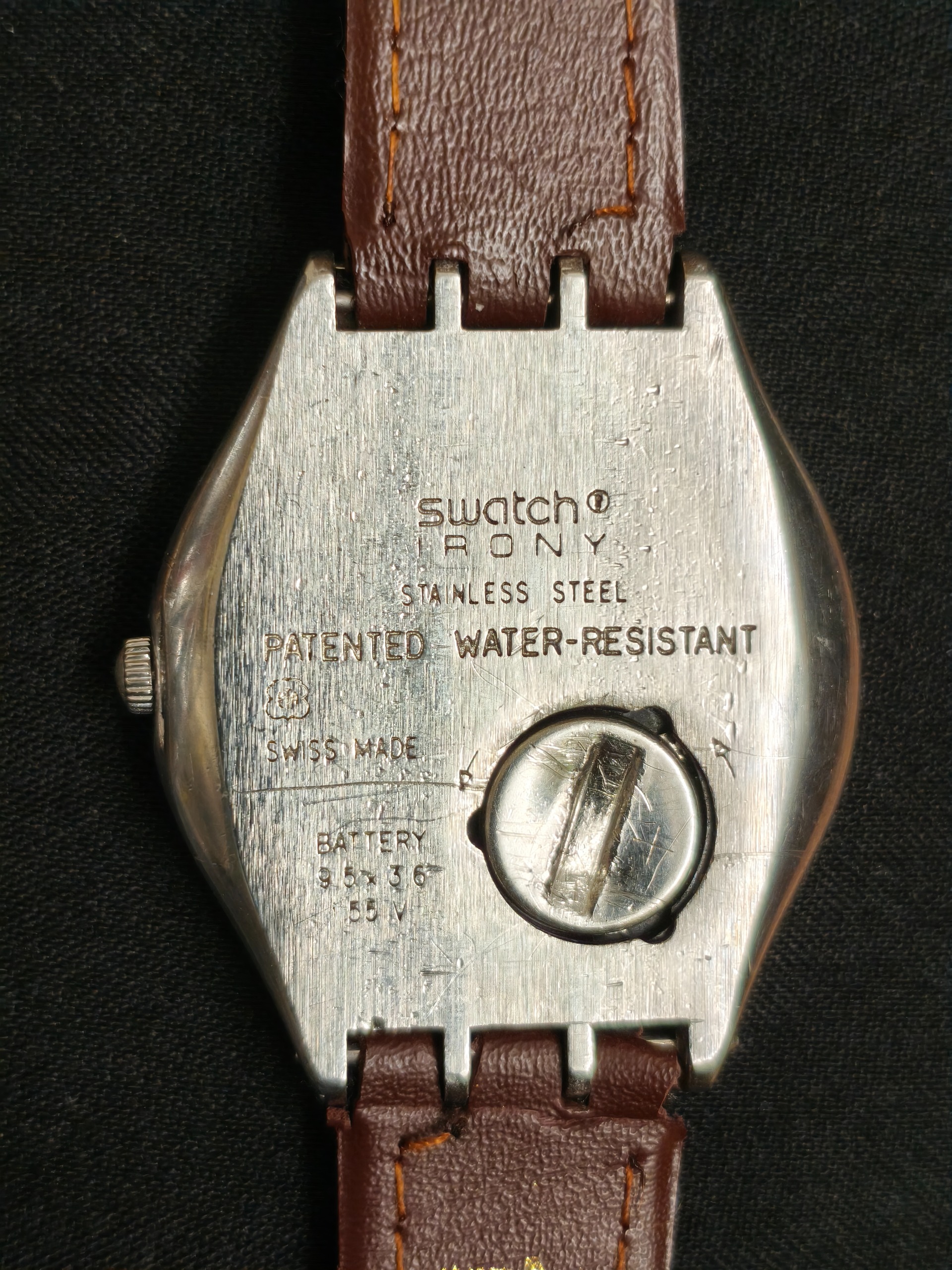 - پشت قاب با حک اختصاصی "SWATCH IRONY SWISS MADE PATENTED WATER-RESISTANT" مشخص شده است.