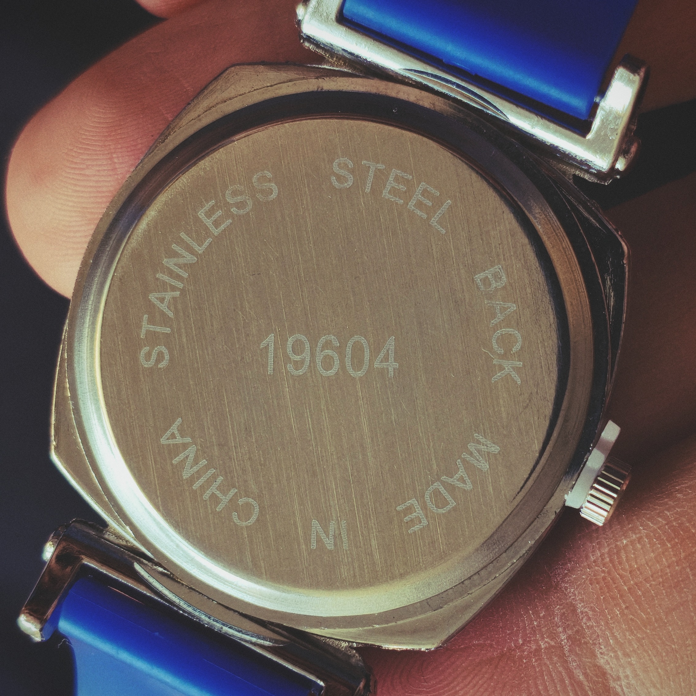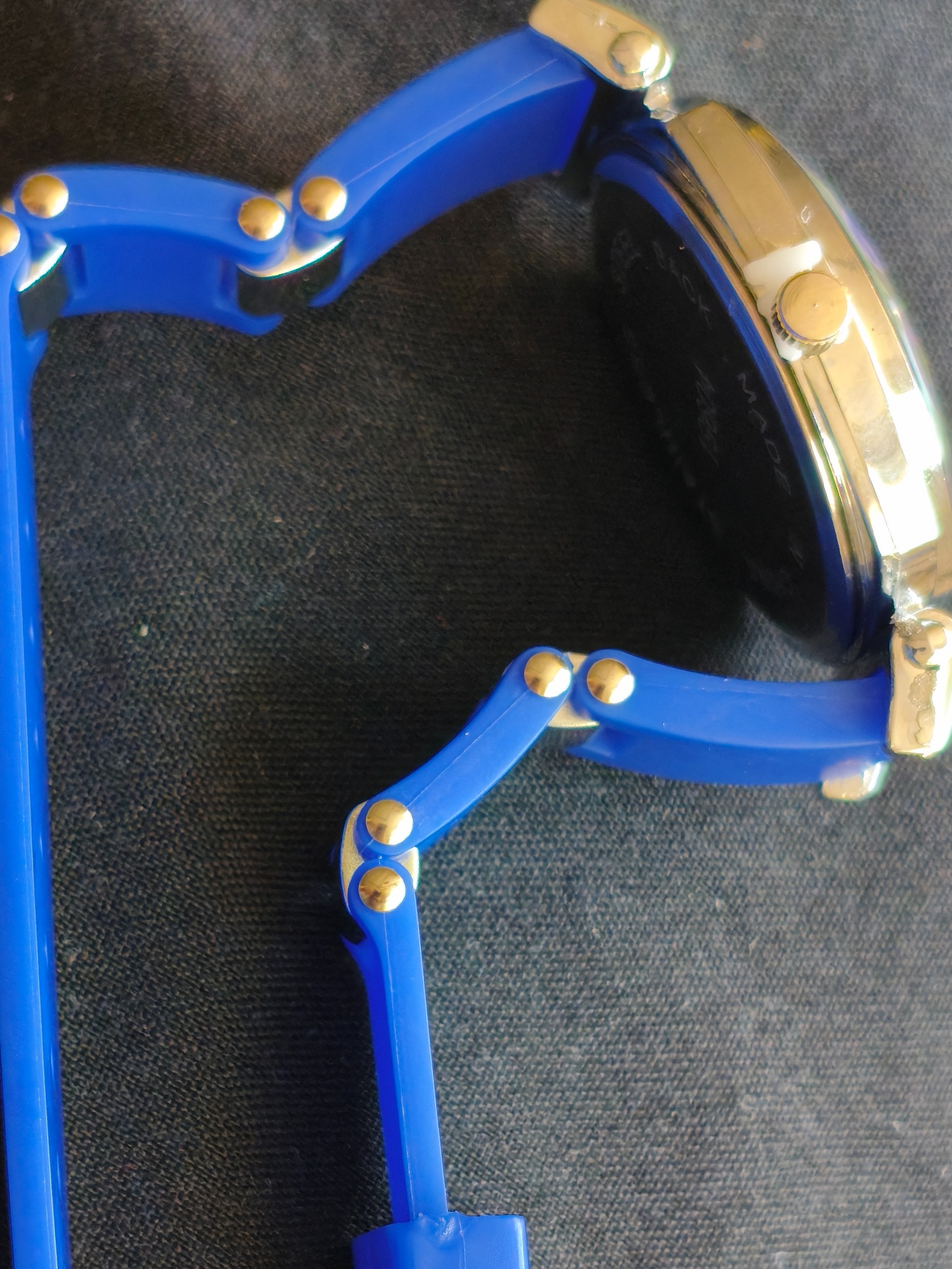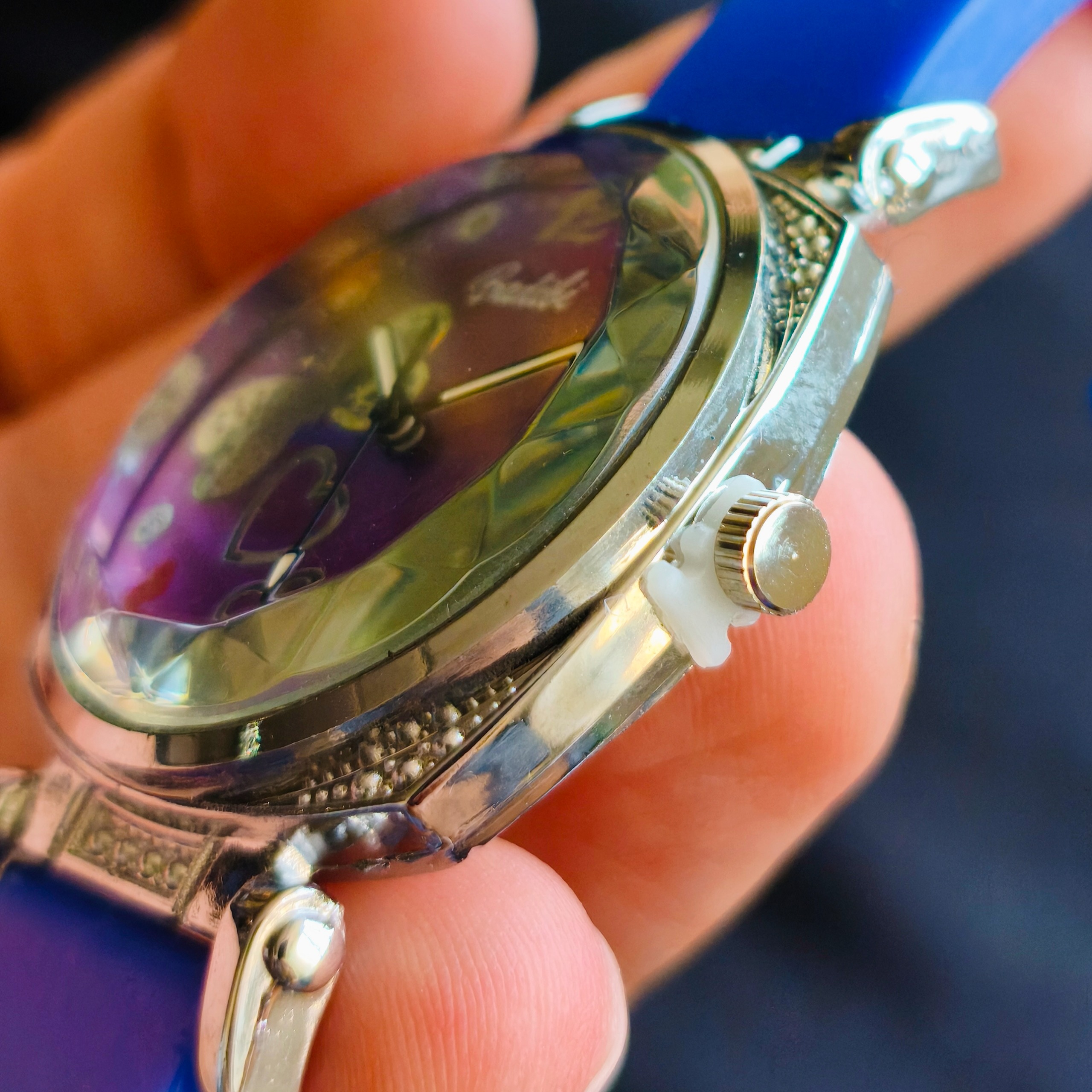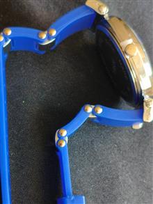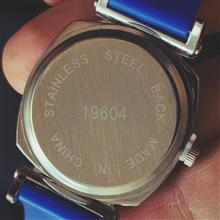 قاب استیل براق با تزئینات ظریف نگیندار، به همراه بند سیلیکونی آبی خوشدست و مقاوم.