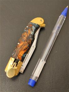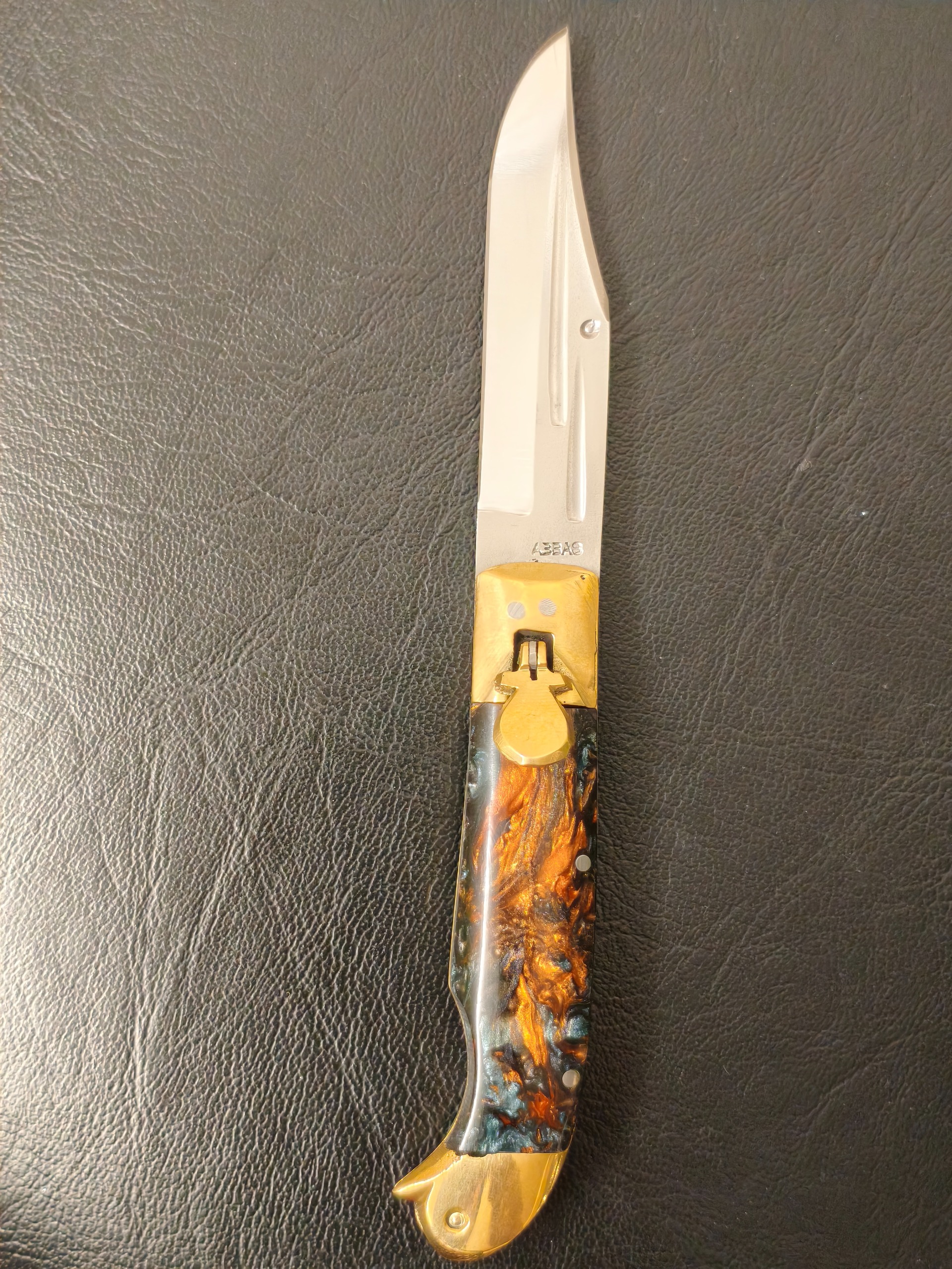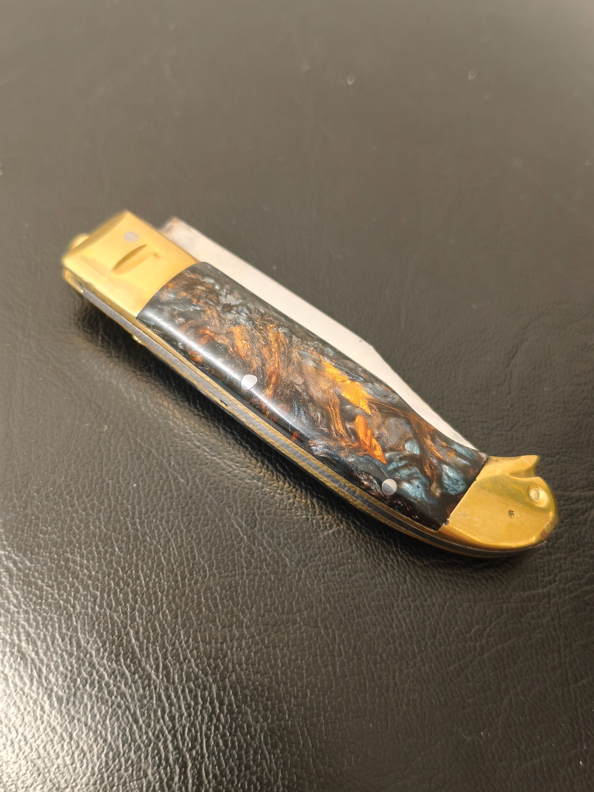 دسته از **برنج خالص** با **رزین آلمانی چندرنگ** ساخته شده که جلوهای همچون شعله و کهربا دارد
