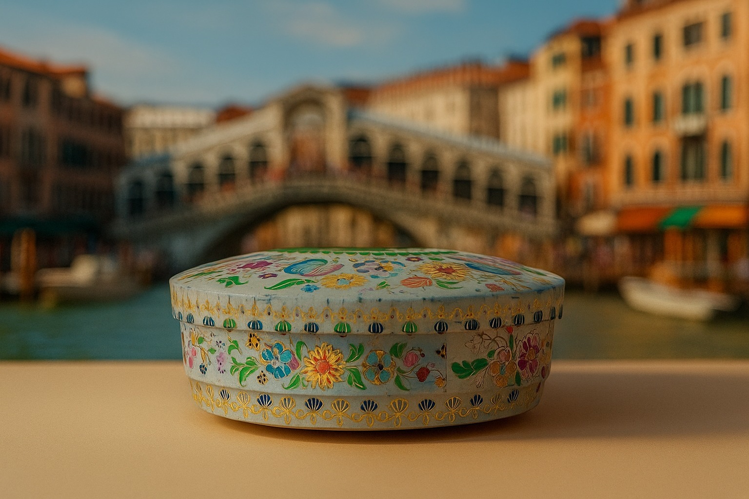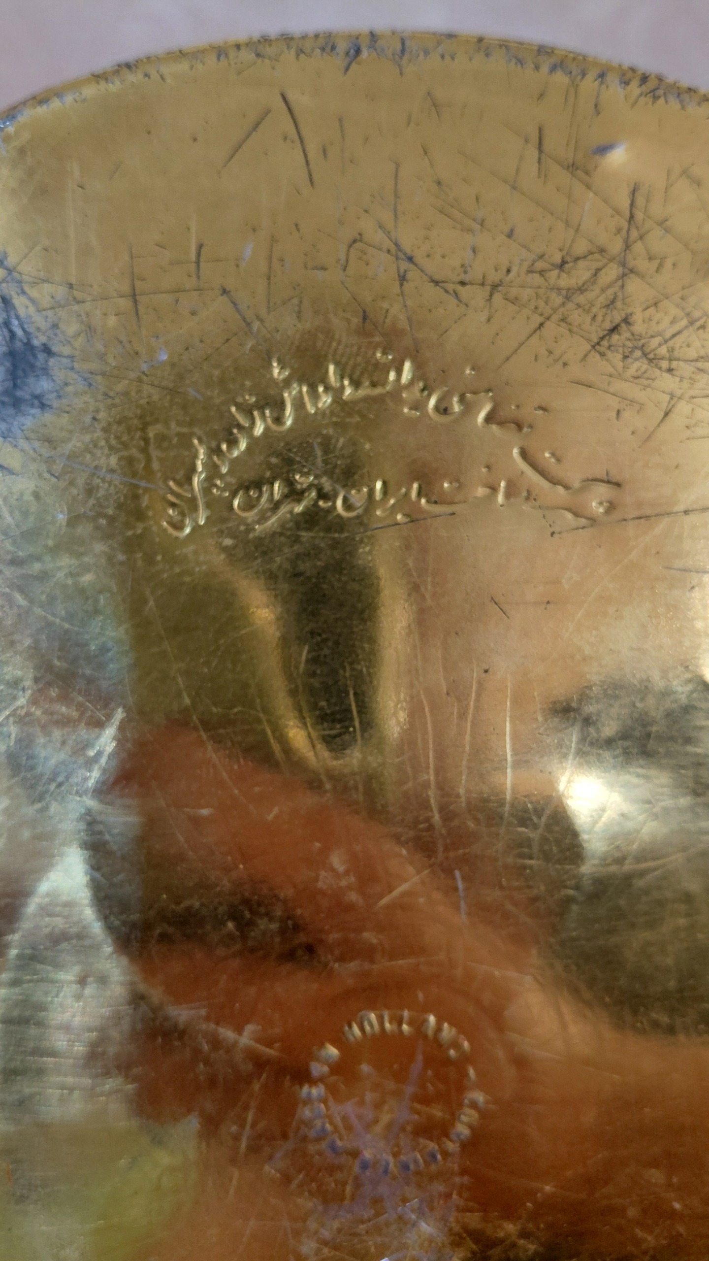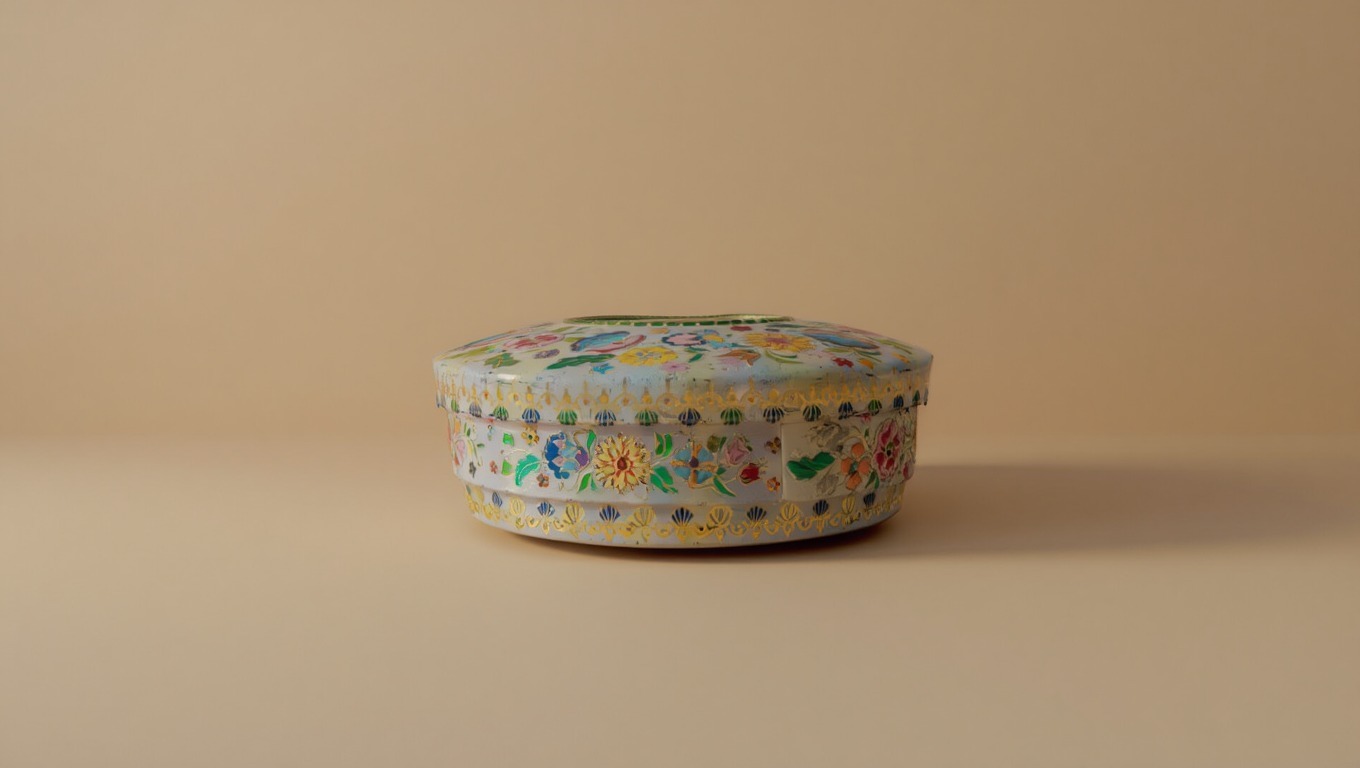 قوطی حلبی قدیمی با رنگهای مختلف شکل کارهای مینا کاری شده و زیر کار برجسته مهر شرکت خورده شده قطر کار 20 سانت.