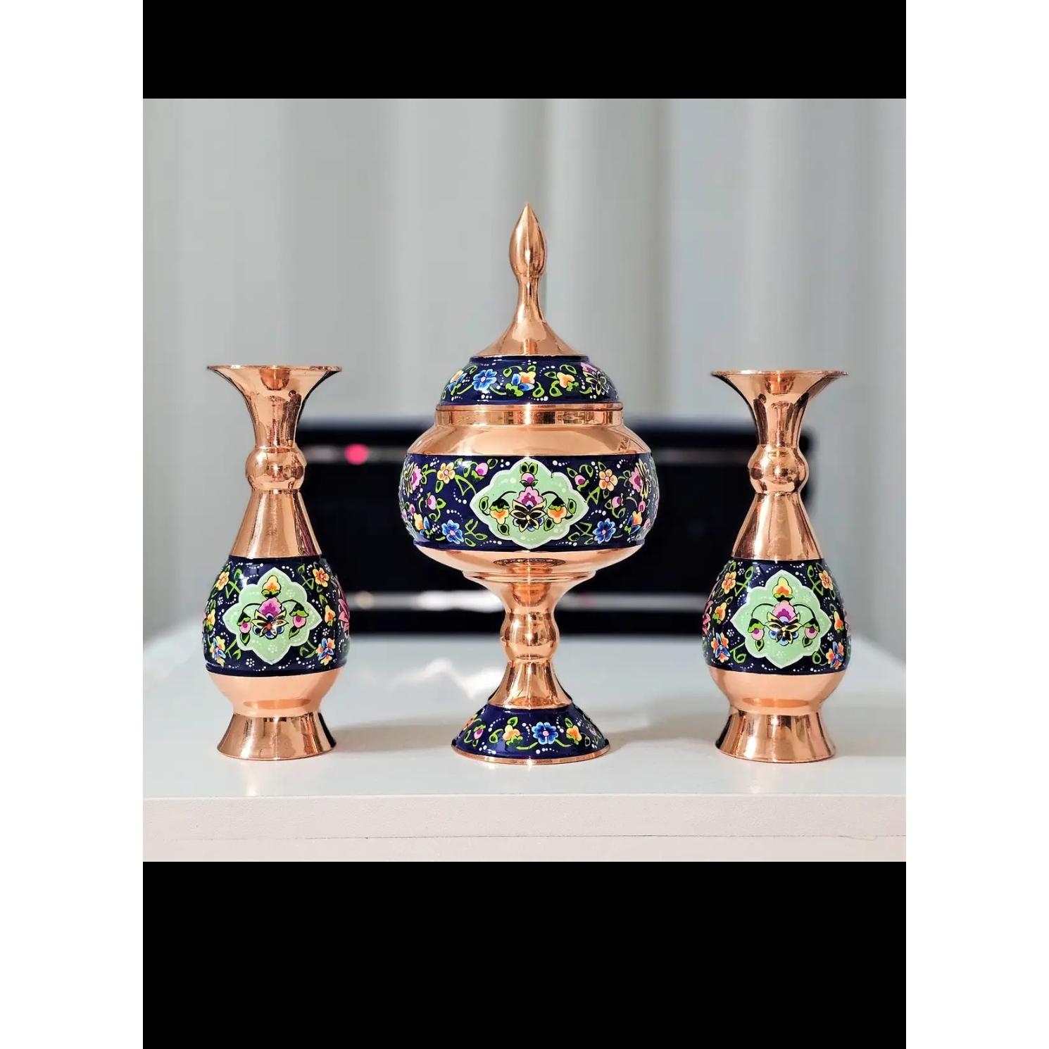 ست گلدان و شکلات خوری مسی مینا کاری