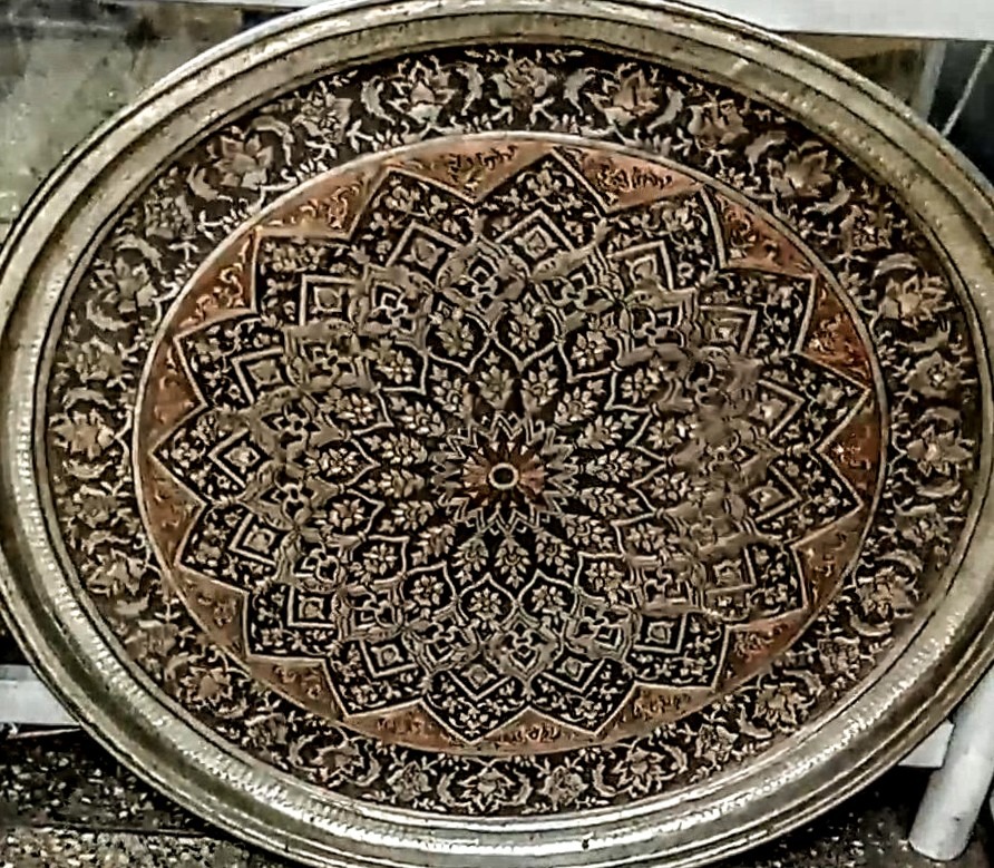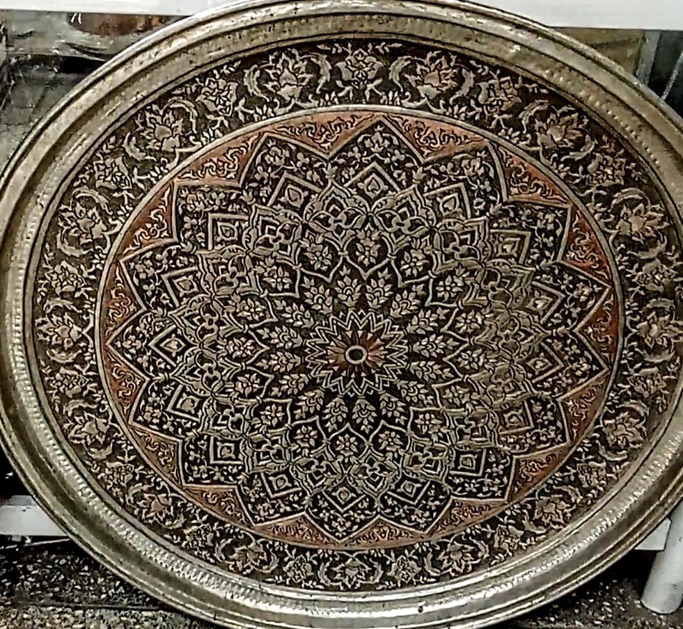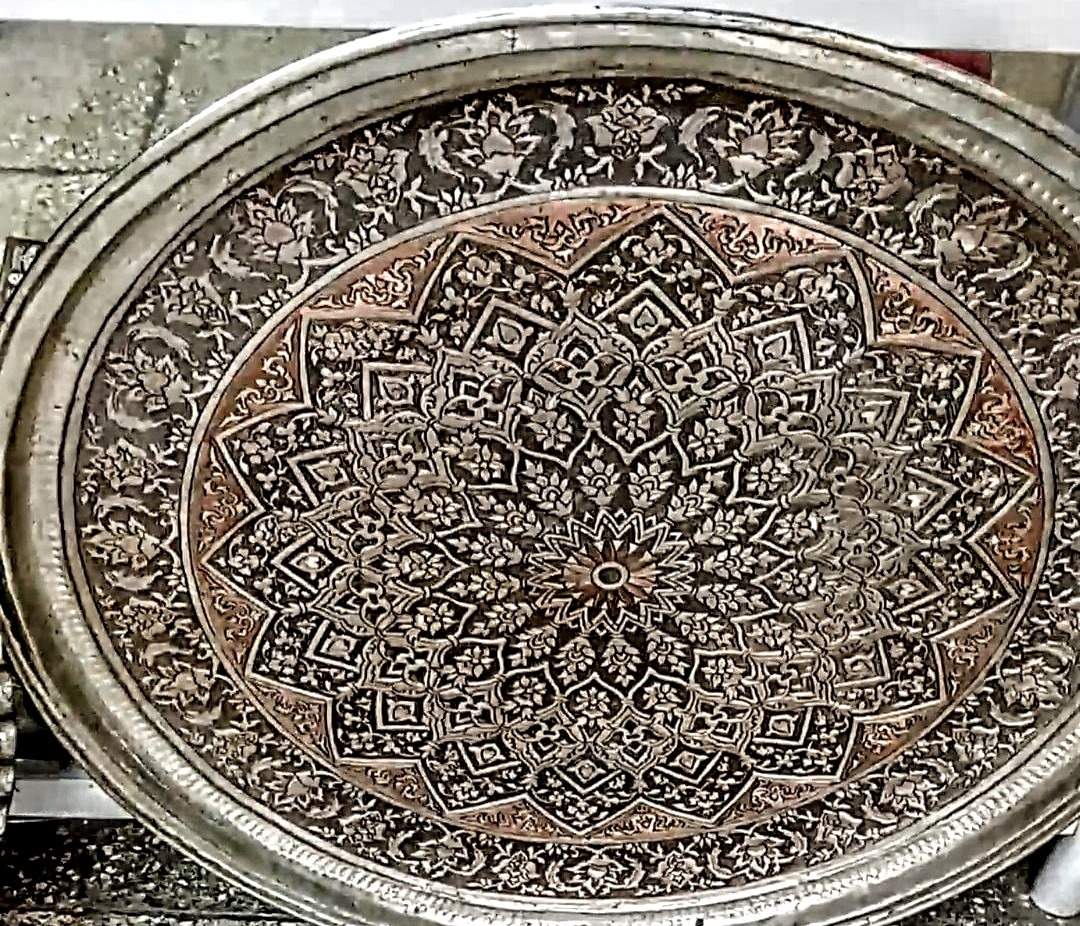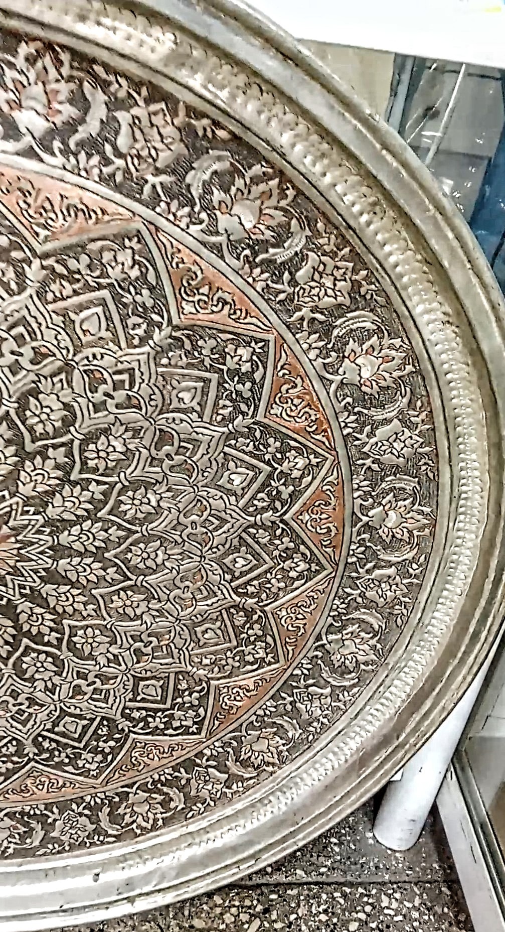 سینی مسی غرق قلم پهلوی طرح اسلیمی با زیبایی تمام هنر رابه تصویر کشیده وکاری دکوری وانتیک قطر65سانت وزن2٫700دوکیلوهفتصد گرم میباشد عکس بیشتر ارسال وهرسوالی باشه درخدمتم وسفارش أنواع عتیقهجات وبدلیجات وسفارش انواع چاقو کلکسیونی وسفارشی وبازاری وقدیمی پذیرفته میشود