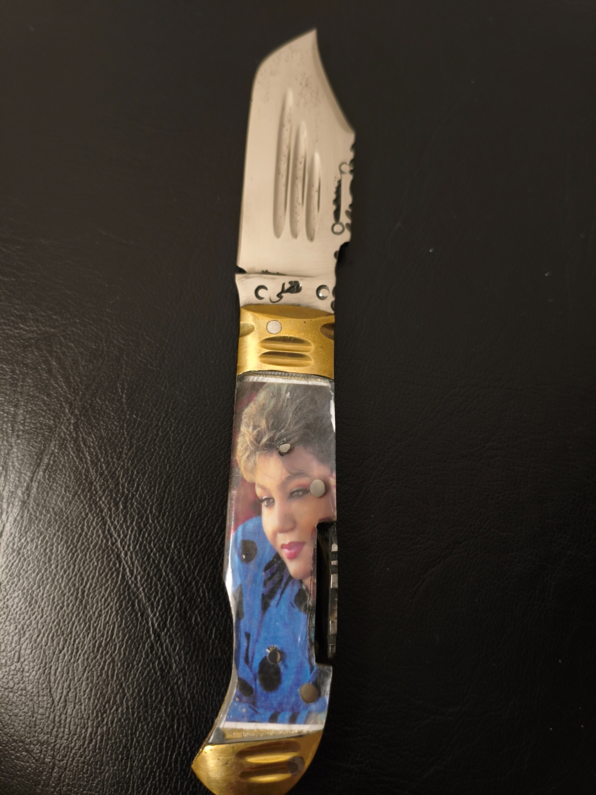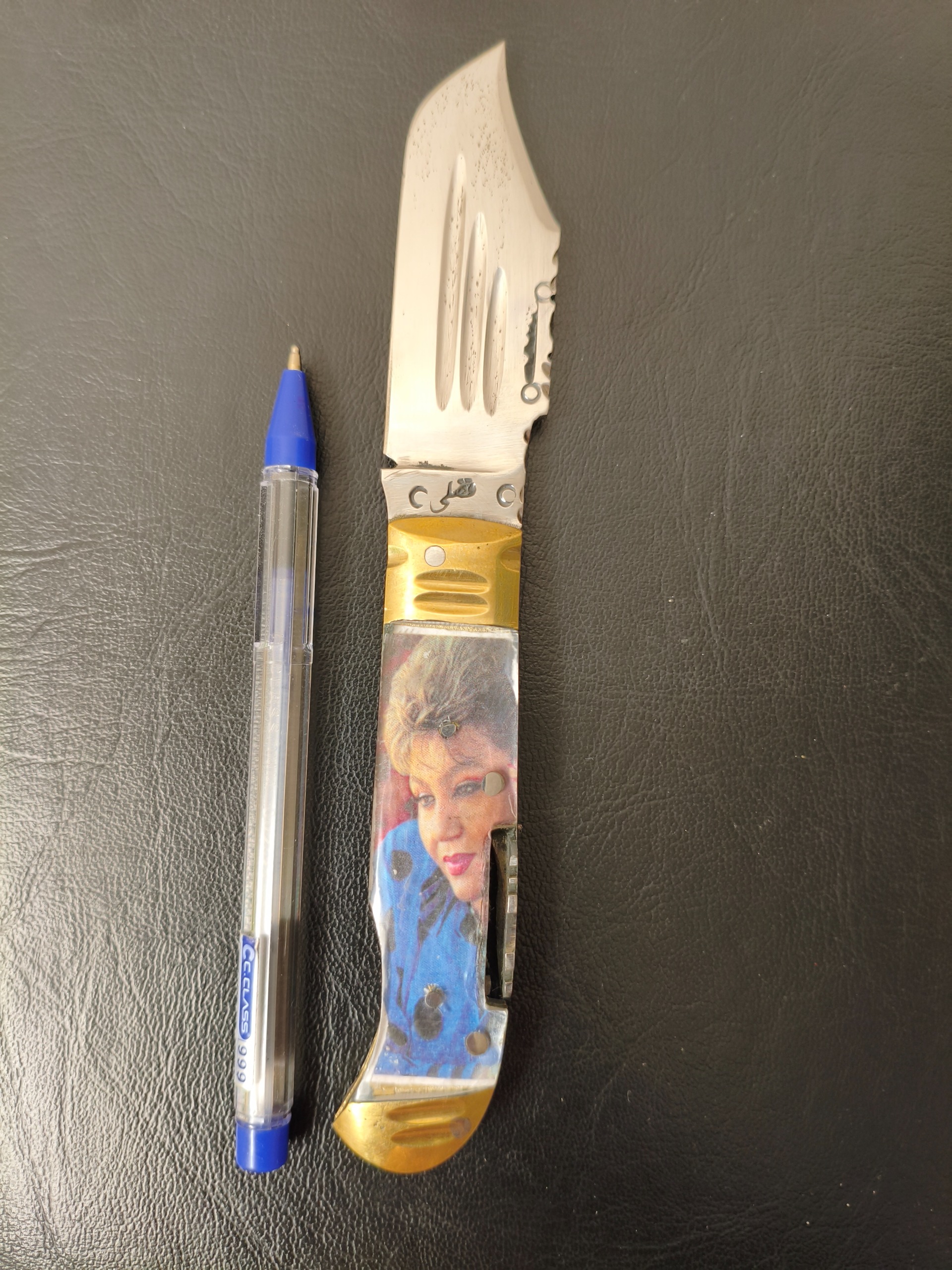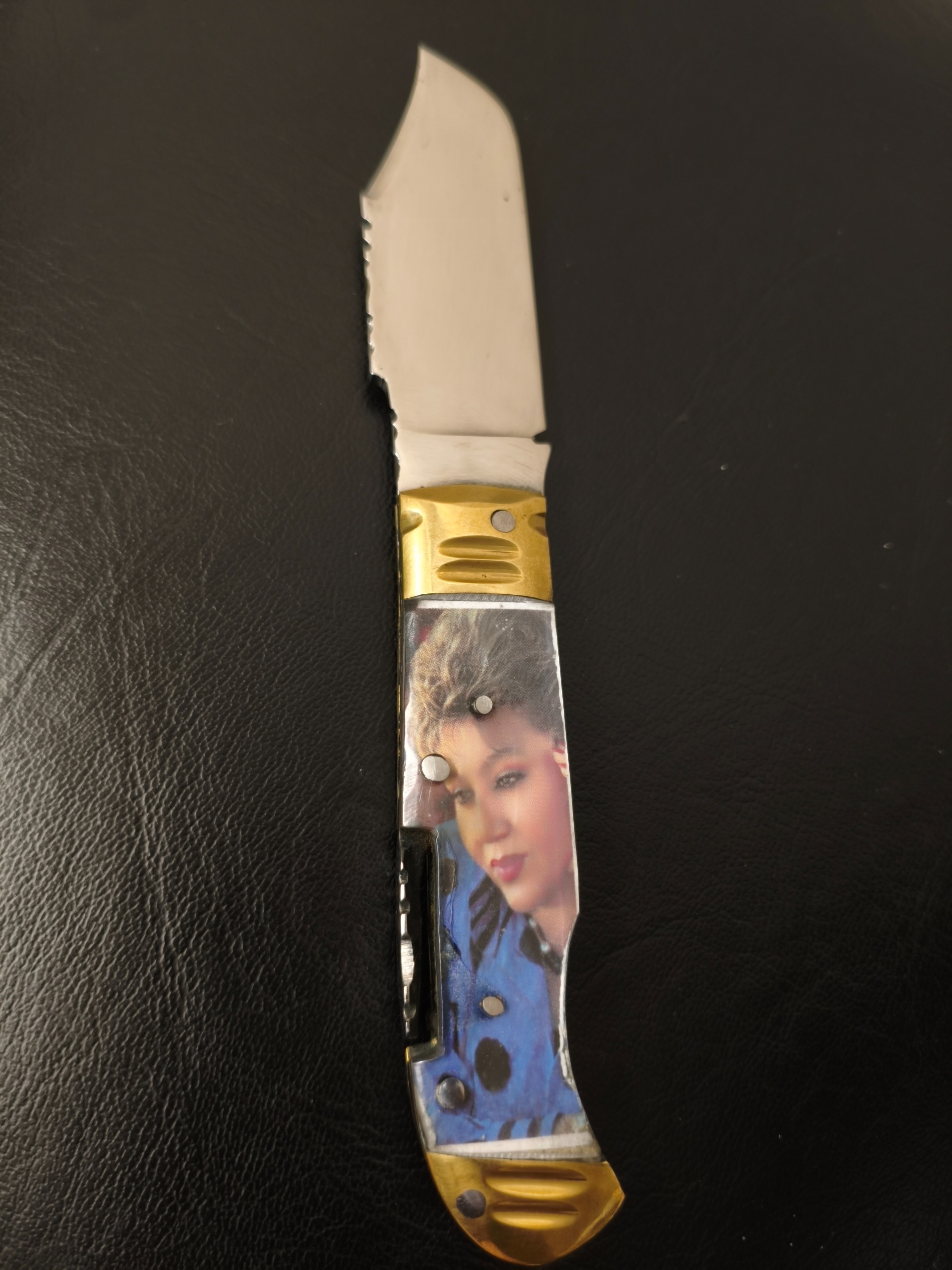 چاقوی ضامندار دکمهای با طراحی تزیینی، ساختهشده با **تیغهٔ فنر تویوتا**، دستهٔ **برنجی و رزینهای شفاف** و تصویری نایاب از **بانوی آواز ایران هایده**.