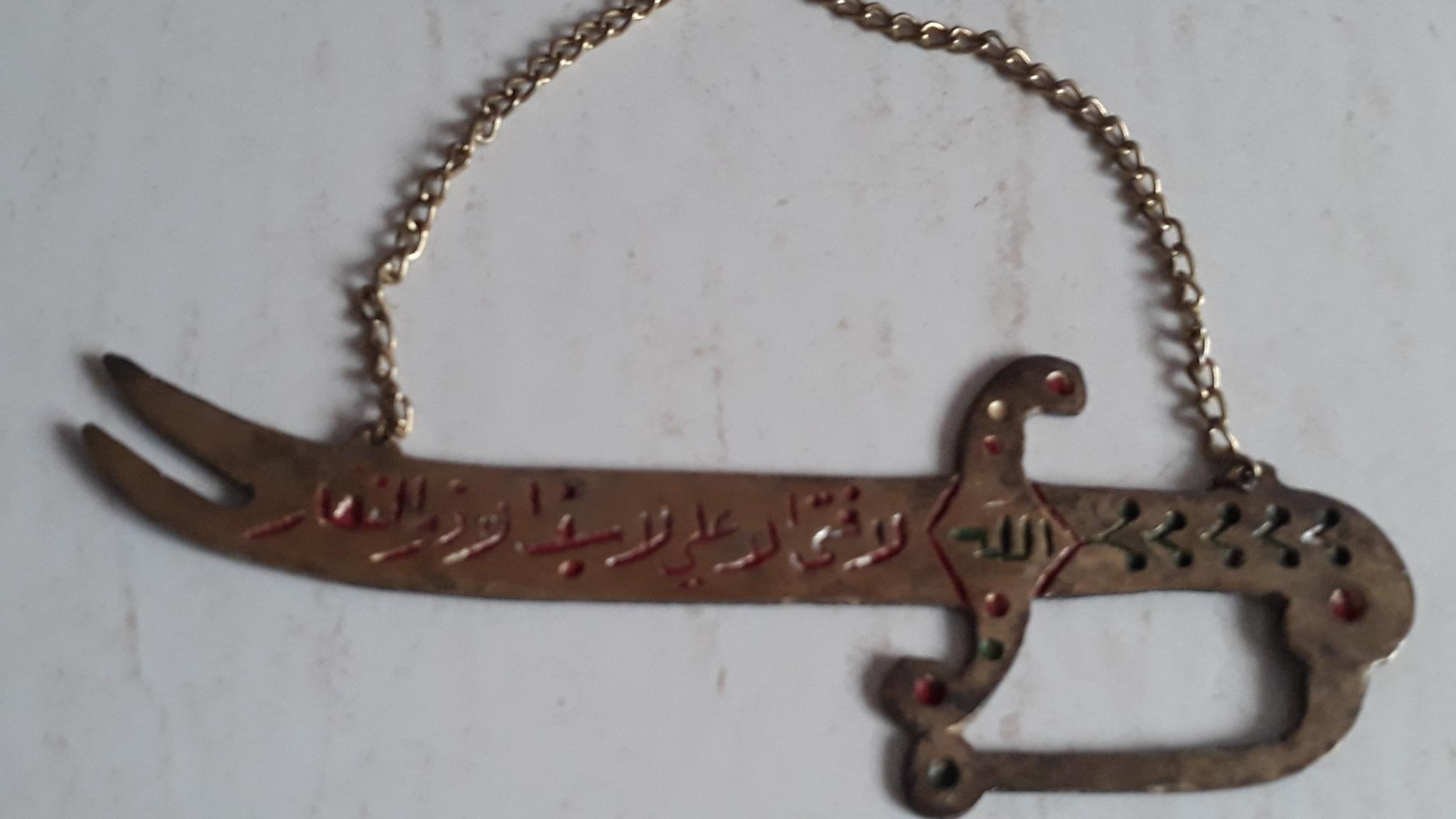 یک عدد شمشیر برنجی تزئینی به شکل ذوالفقار . بسیار قدیمی . ضخیم و سنگین متناسب با سایز . 23 سانتی متر . زنجیر برنجی و قدیمی نمیباشد و خودم به شمشیر تزئینی اضافه نمودم . سمت دیگر صاف است و نوشته ندارد . وزن کالا با احتساب بسته بندی و حدودی ذکر شده است