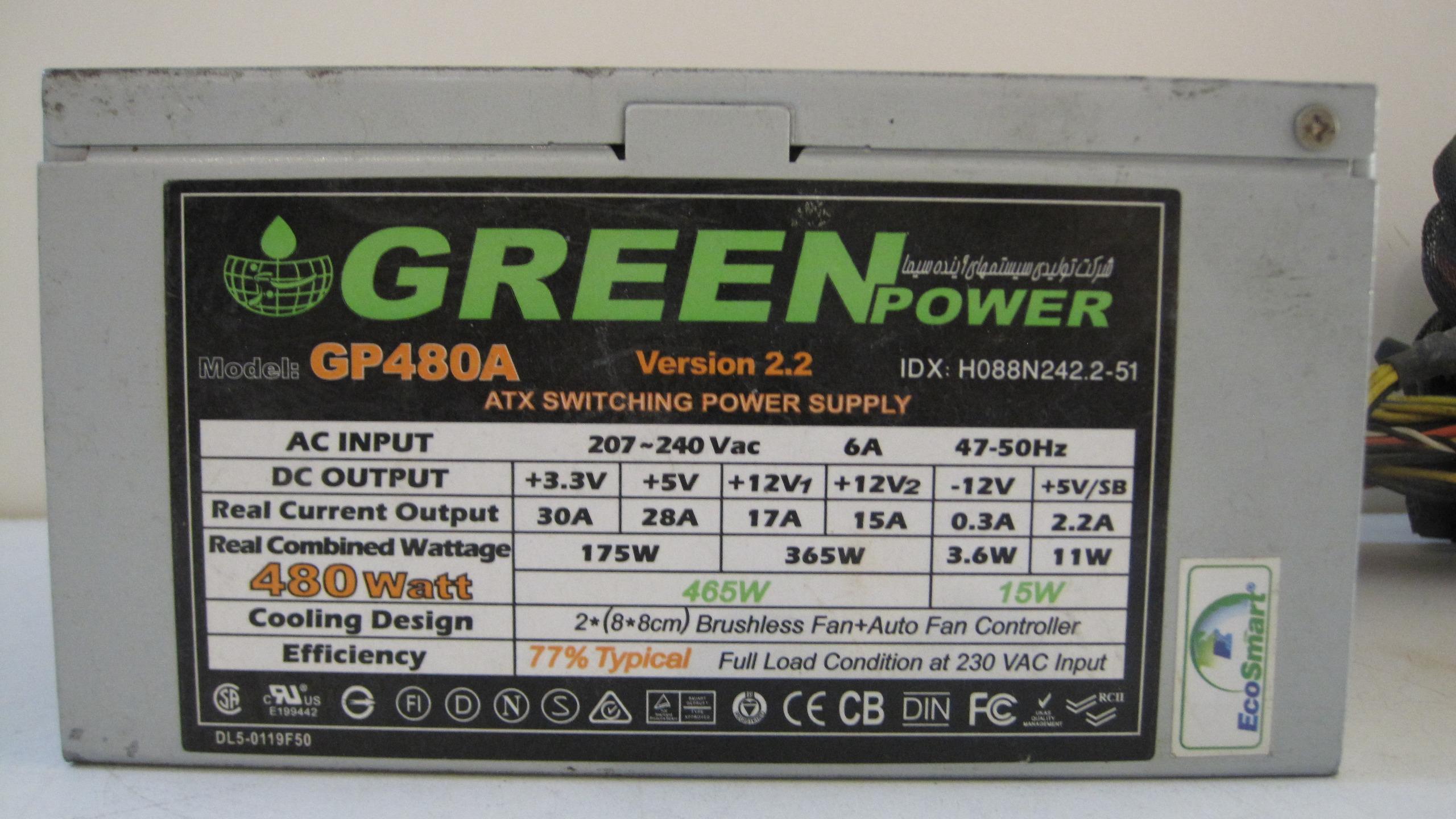 کالا یکعدد پاور 480 وات واقعی از برند گرین مدل GP480AB Ver2.2 GREEN میباشد، سوکت برق مادربرد 24 پین و چهار عدد ساتا و دو عدد چهار پین سی پی یو و یک عدد شش پین گرافیک
