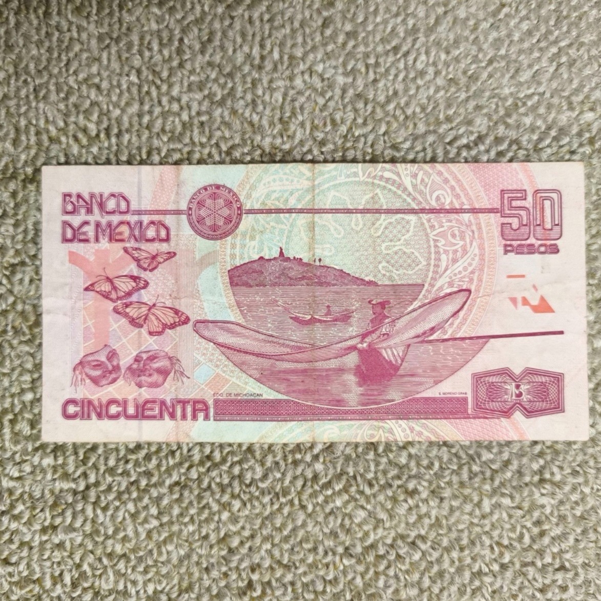 اسکناس 50 پزوی مکزیک نوع کاغذی سری EE برای سال 2002 میلادی، بسیار کمیاب و ارزشمند. روی اسکناس تصویری از خوسه ماریا تکلو مورلوس (1765 1815)، کشیش کاتولیک و یکی از رهبران جنبش استقلال مکزیک است که پس از اعدام میگل ایدالگو در سال 1811 به دست اسپانیاییها در طول جنگ استقلال مکزیک رهبری این قیام را در دست گرفت. پشت اسکناس به جز منظره ی دریاچه و مرد ماهیگیر با تصویری از پروانه های شهریار که همه ساله در زمستان از کوه های راکی به منطقه ی سیرامادره مکزیک مهاجرت می کنند و از نمادهای ارزشمند مکزیک هستند تزئین شده است. اسکناس فاقد پارگی یا خط خوردگی خودکار هست و صرفاً دو سه تای کیفی دارد طبق تصویر.