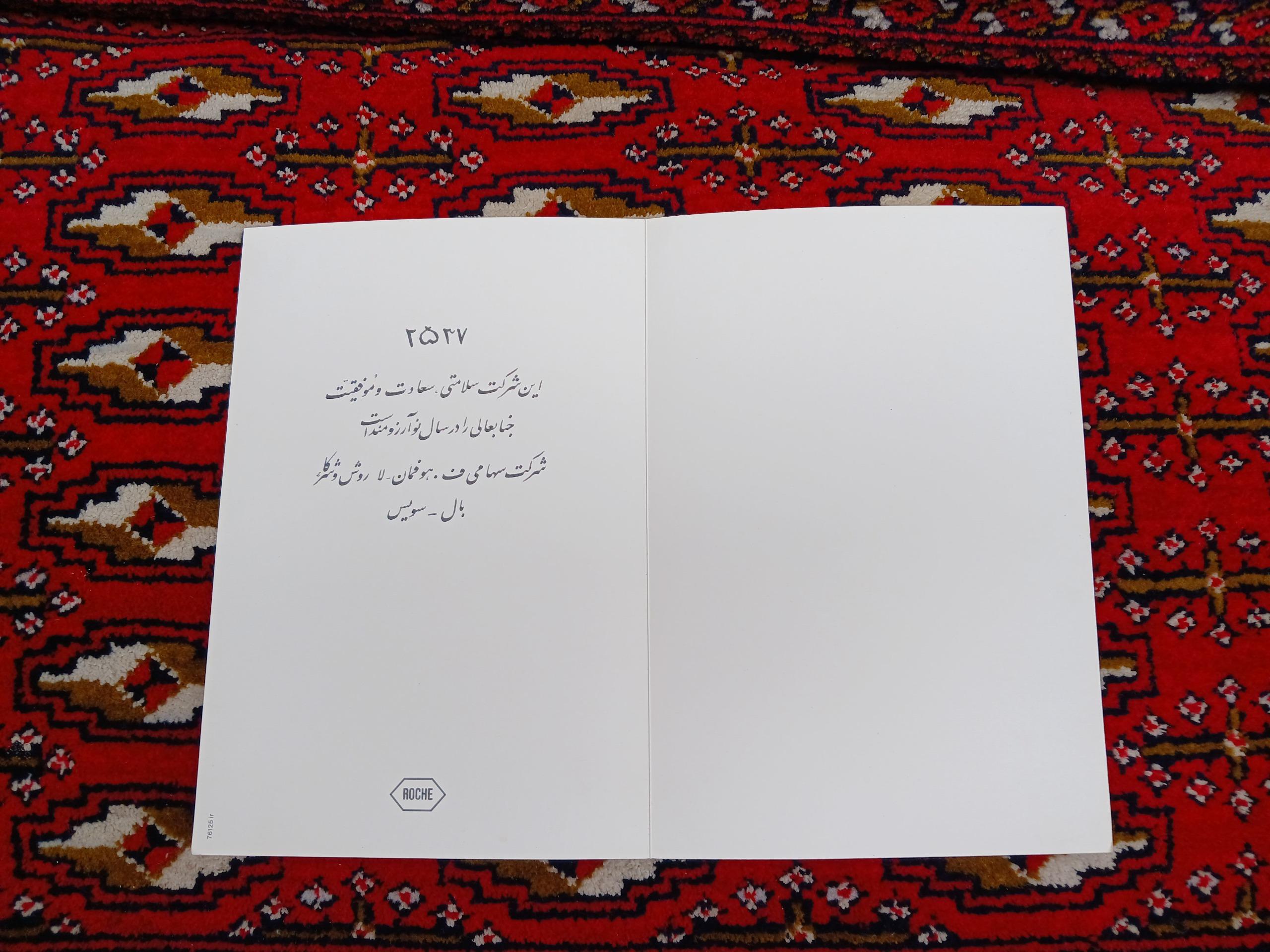 کارت پستال قدیمی کیفیت یک بدون ایراد خیلی تمیز مونده مال زمان پهلوی اهدا شده از طرف شرکت سهامی ف. هوفمان لا روش وشرکا ،بال سویس اندازه در حالت تا شده 16×23/5، و در حالت باز شده 23/5×32 سانت است با تاریخ 2537