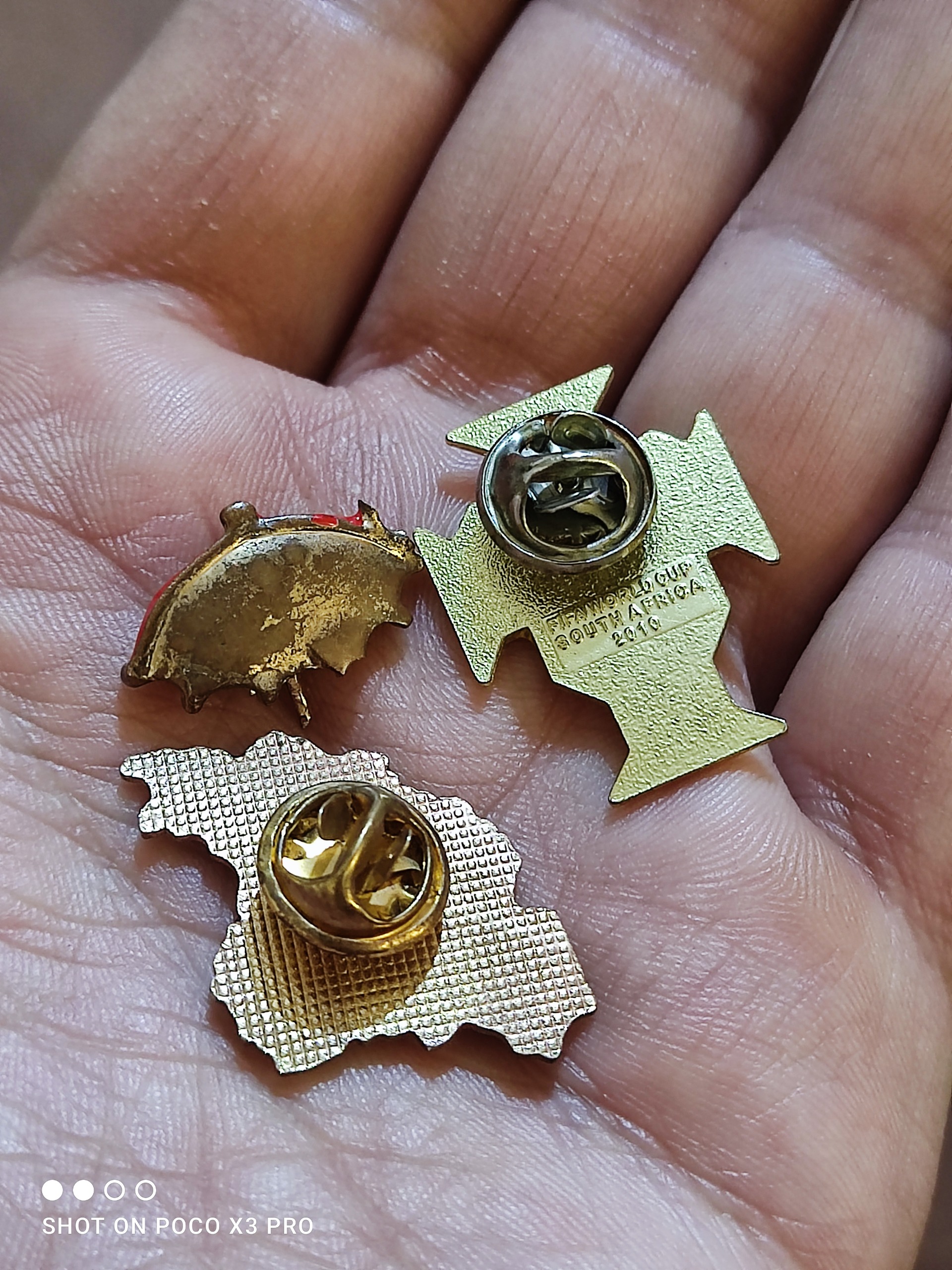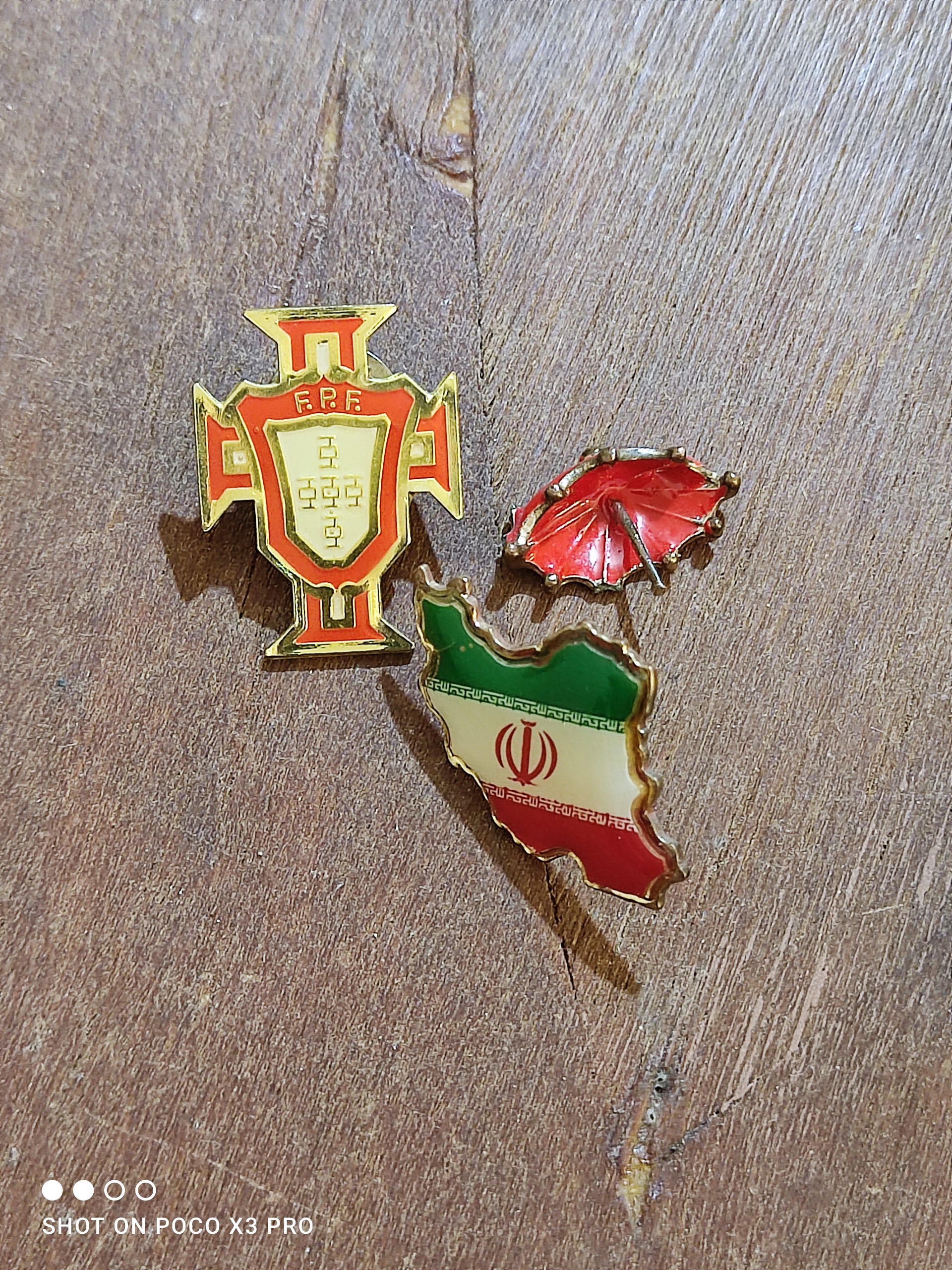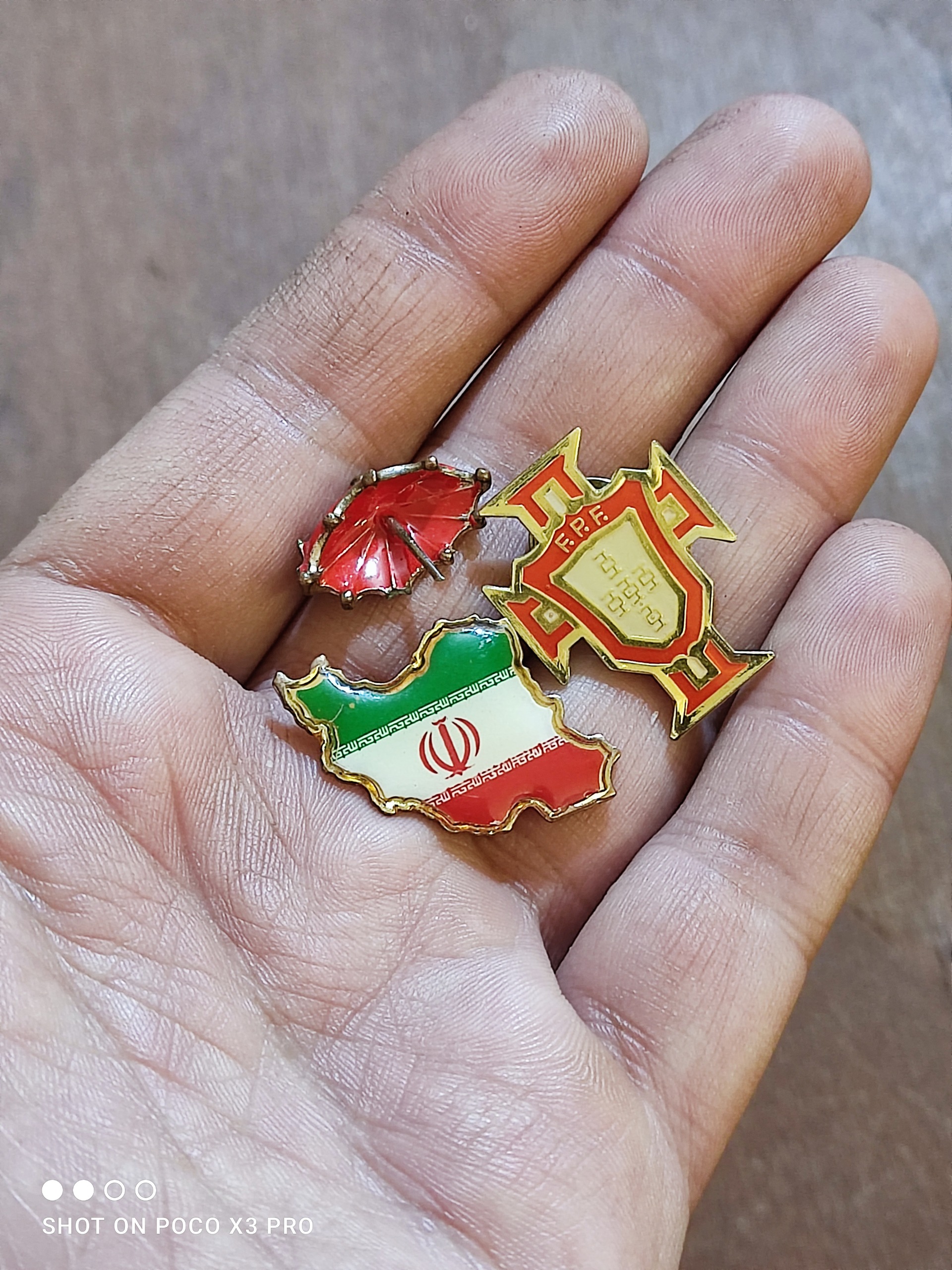 سه عدد بج سینه بسیار زیبا و خاص یدونش ایرانیه دوتاش خارجی قیمت برای هر سه مورده مطابق تصاویر یکیش پرچم و لوگوی ایرانه یکیشم شبیع یه چطر باز شده هست یکی دیگشم احتمالا لوگوی یه باشگاه ورزشی هست البته پشتش و جلوش نوشته شده