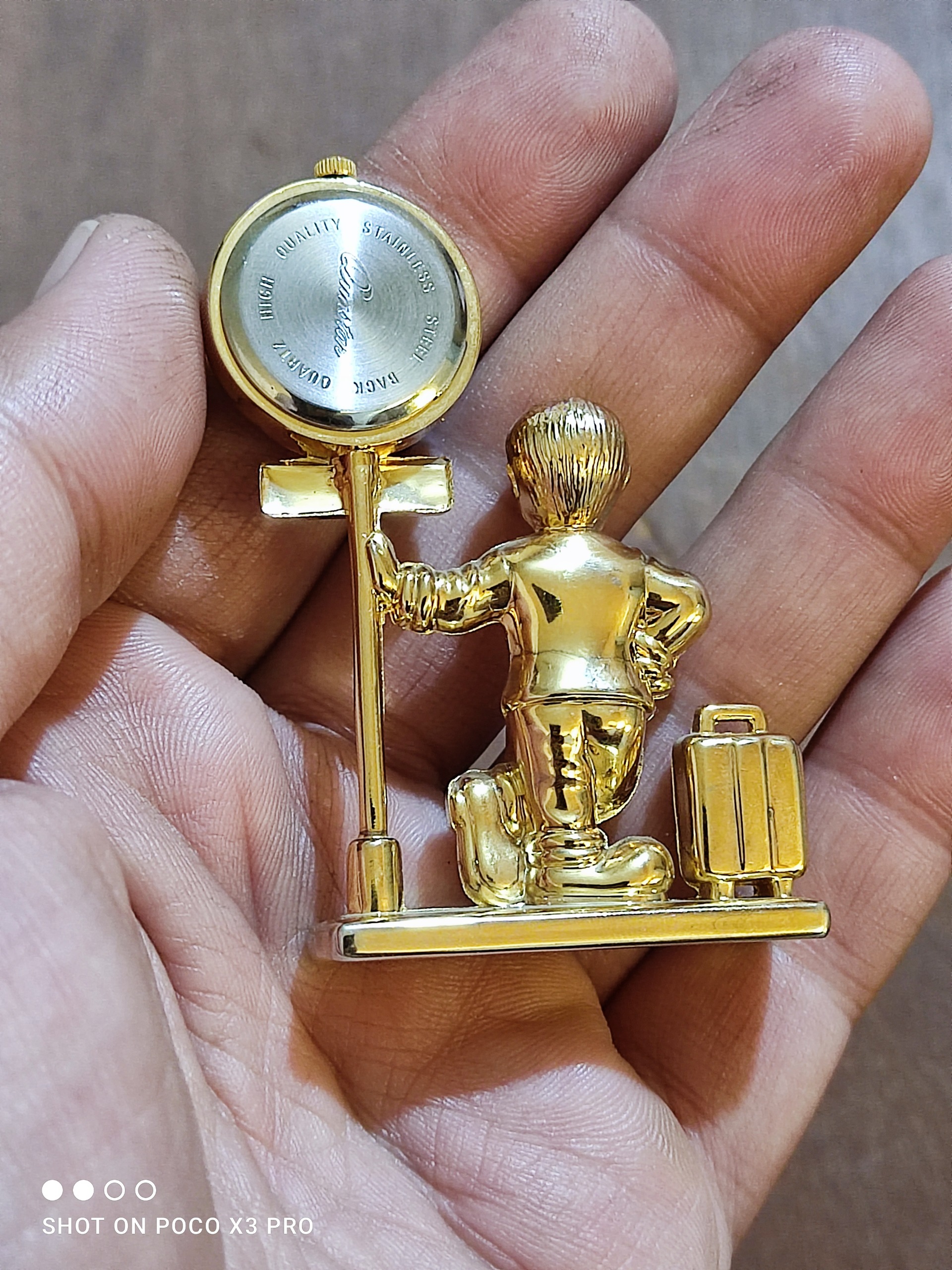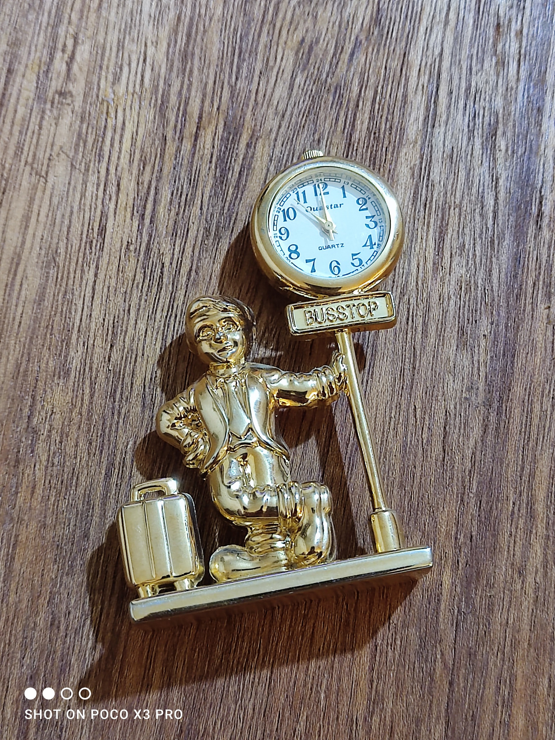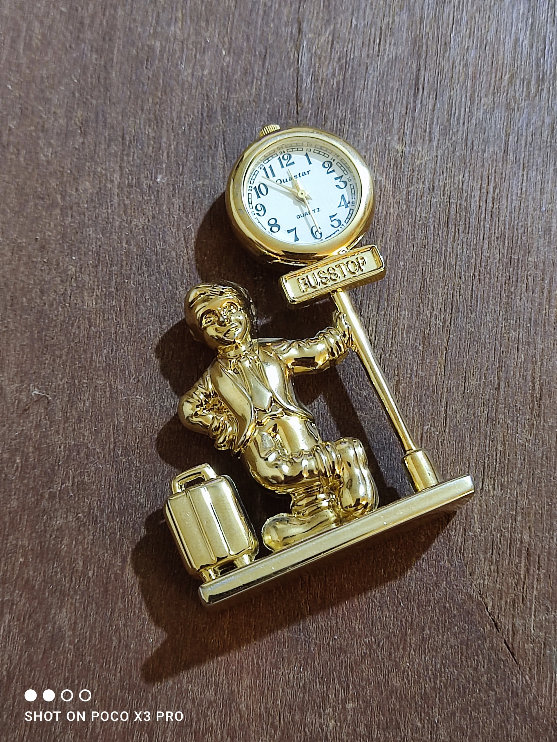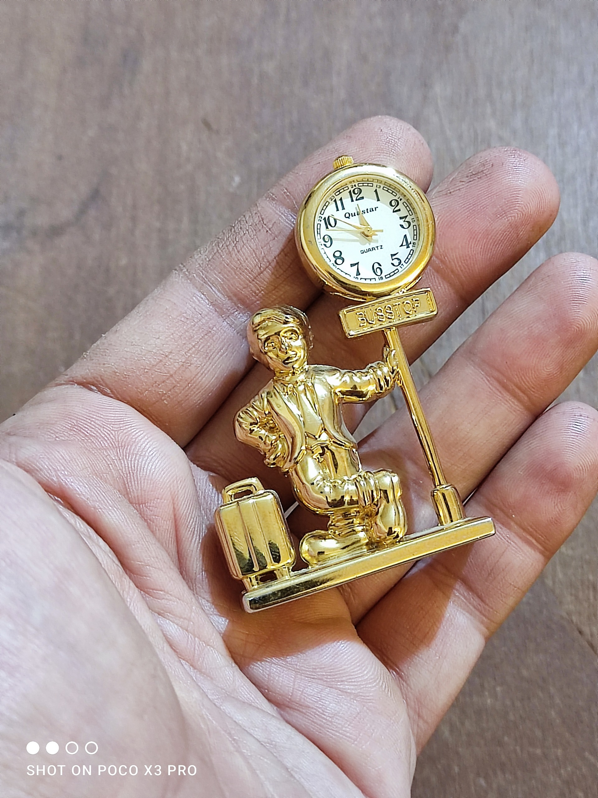 یک عدد ساعت طلایی برنزی بسیار زیبا و خاص مطابق تصاویر این ساعت با باتری کار میکنه سایزش مشخصع نسبتا کوچک جنسش از برنز با همون برنجی بسیار سنگین و جوندار و توپر هست نو نو آک باتری اولشه هنوز واقعا این ساعت زیباست بسیار زیباتر از عکسش