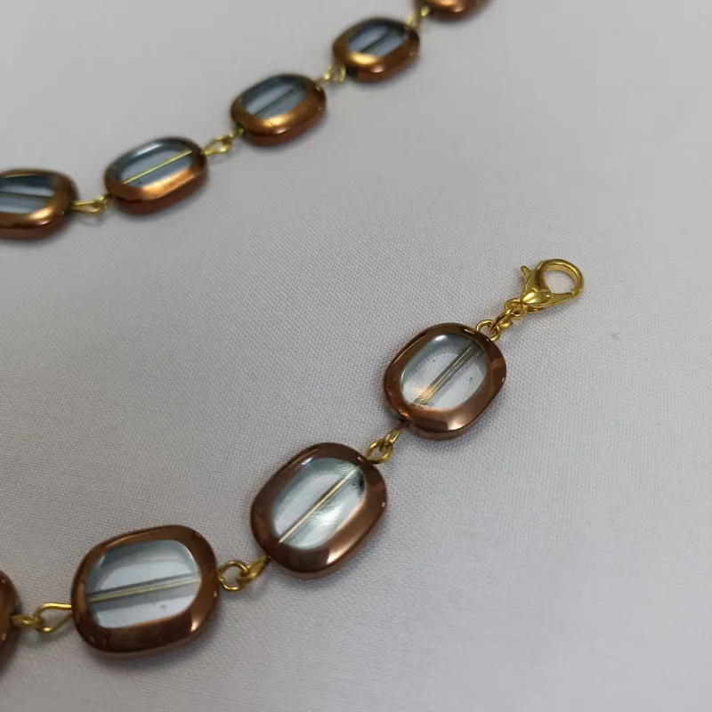 درتوضیحات نوشته شده که نگین دارد و منظور اون نگین هایی است که بهم متصل شده اند و جنس نگین هایی که بهم متصل شده اند از نوعی رزین است و با اتصالی محکم توسط نوعی زنجیر استیل که با رنگ طلایی آبکاری شده است به یکدیگر متصل شده اند.