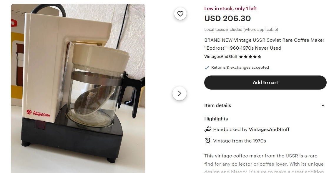 این قهوه ساز قدیمی از اتحاد جماهیر شوروی ، یک کالای نادر برای هر کلکسیونر یا عاشق قهوه است. با طراحی و تاریخچه منحصر به فرد خود، مطمئناً به هر آشپزخانه یا کلکسیونی جلوه ای عالی خواهد بخشید. برند بودروس به دلیل کیفیت و دوامش شناخته شده است و این قهوه ساز را