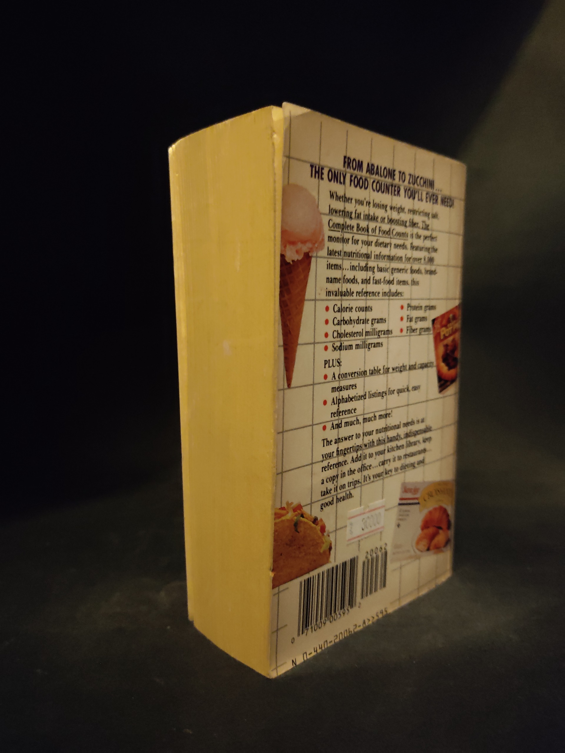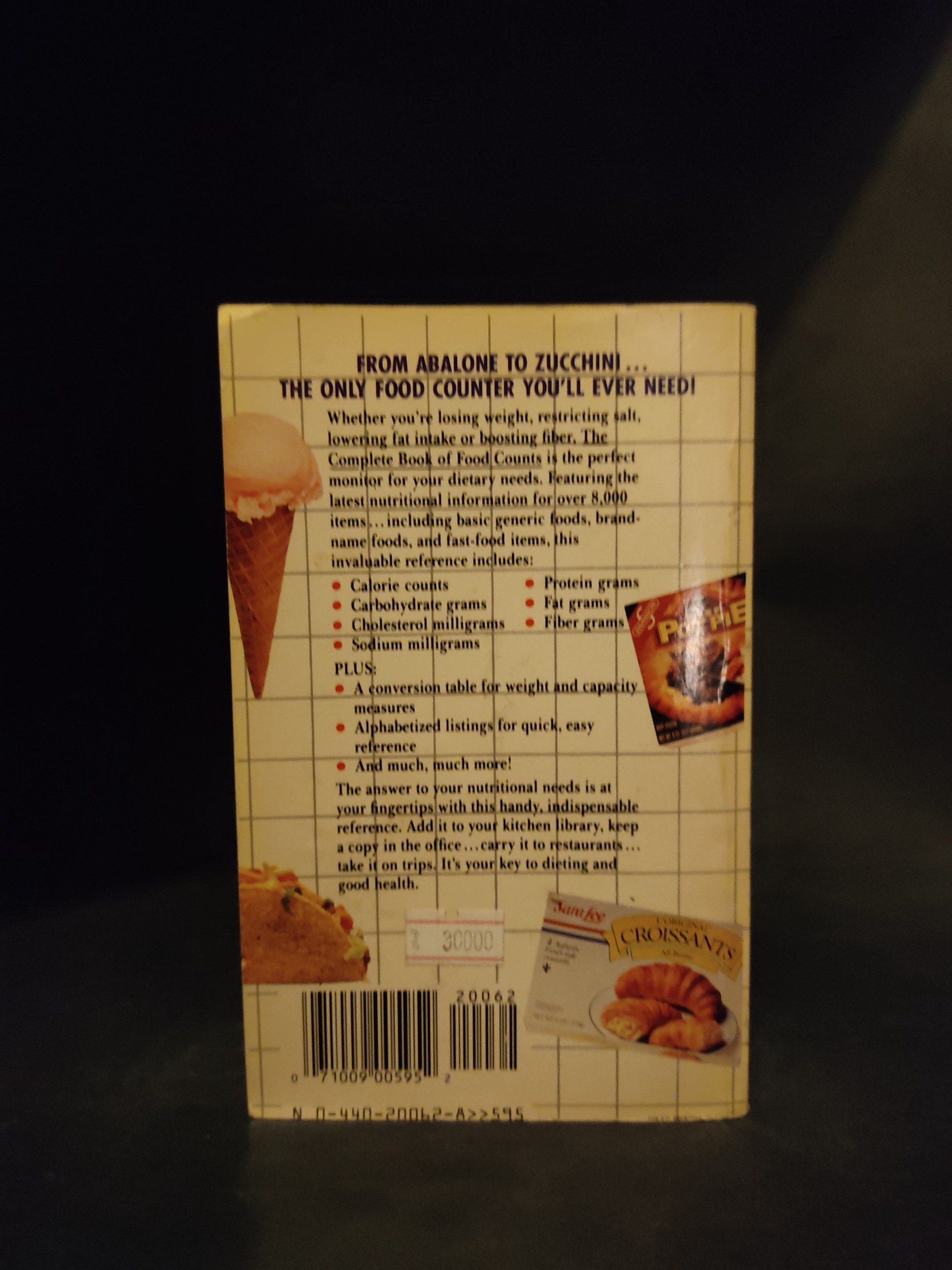 Whether youre losing weight, restricting salt. lowering fat intake or boosting fiber. The Complete Book of Food Counts is the perfect monitor for your dietary needs. Featuring the latest nutritional information for over 8,000 items... including basic generic