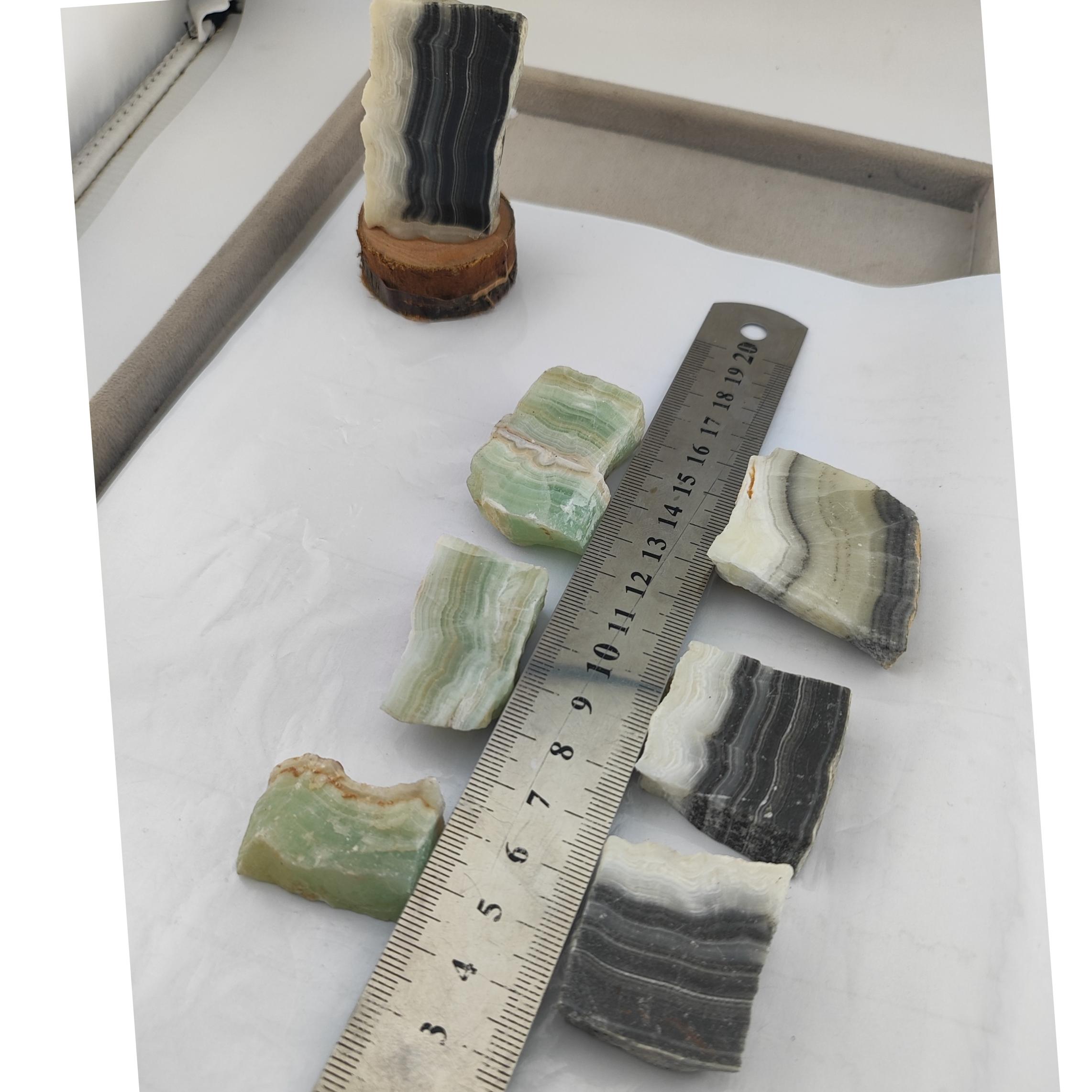 شش عدد آراگونیت سبز و مشکی به همراه پایه چوبی نگهدارنده