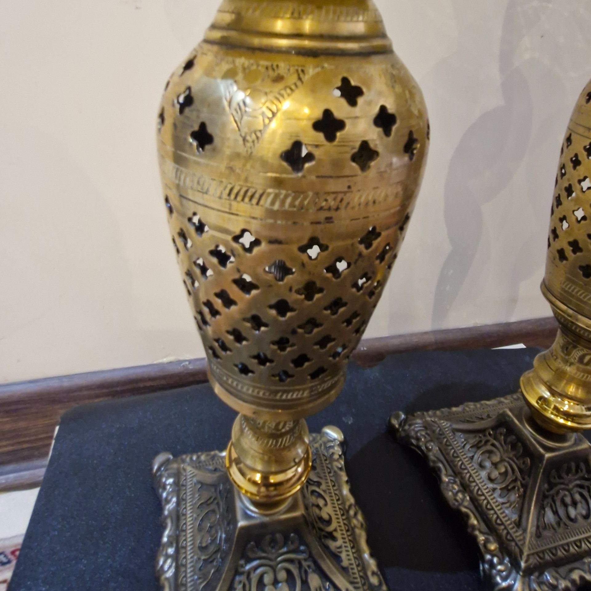 جفت شمعدان زیبا به ارتفاع حدود 60 سانت جنس تنه از برنج و جنس پایه بخاطر سنگین بودن خشکه یا سرب خشک و حلقه زیر حباب از جنس آهن میباشد بسیار زیبا و نو