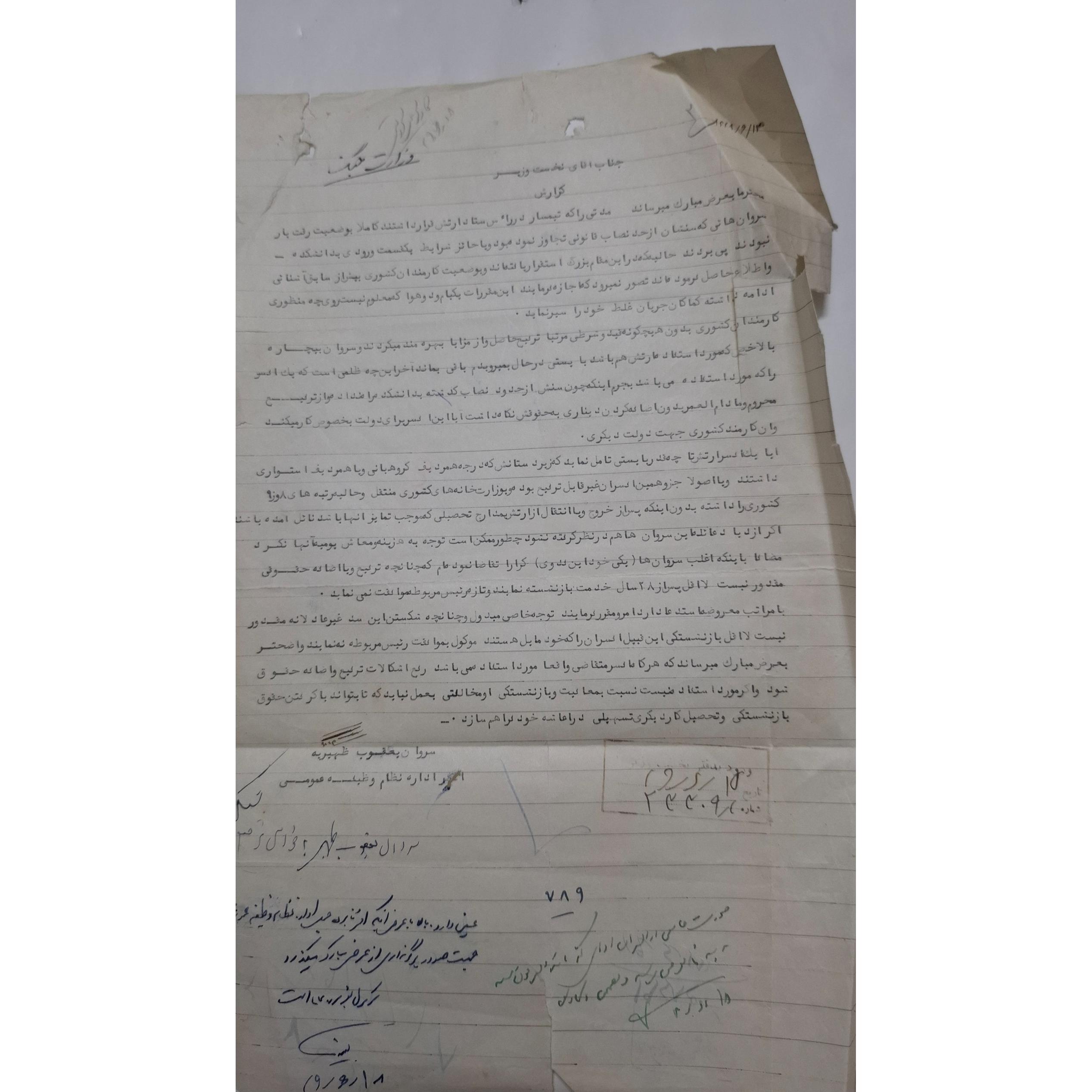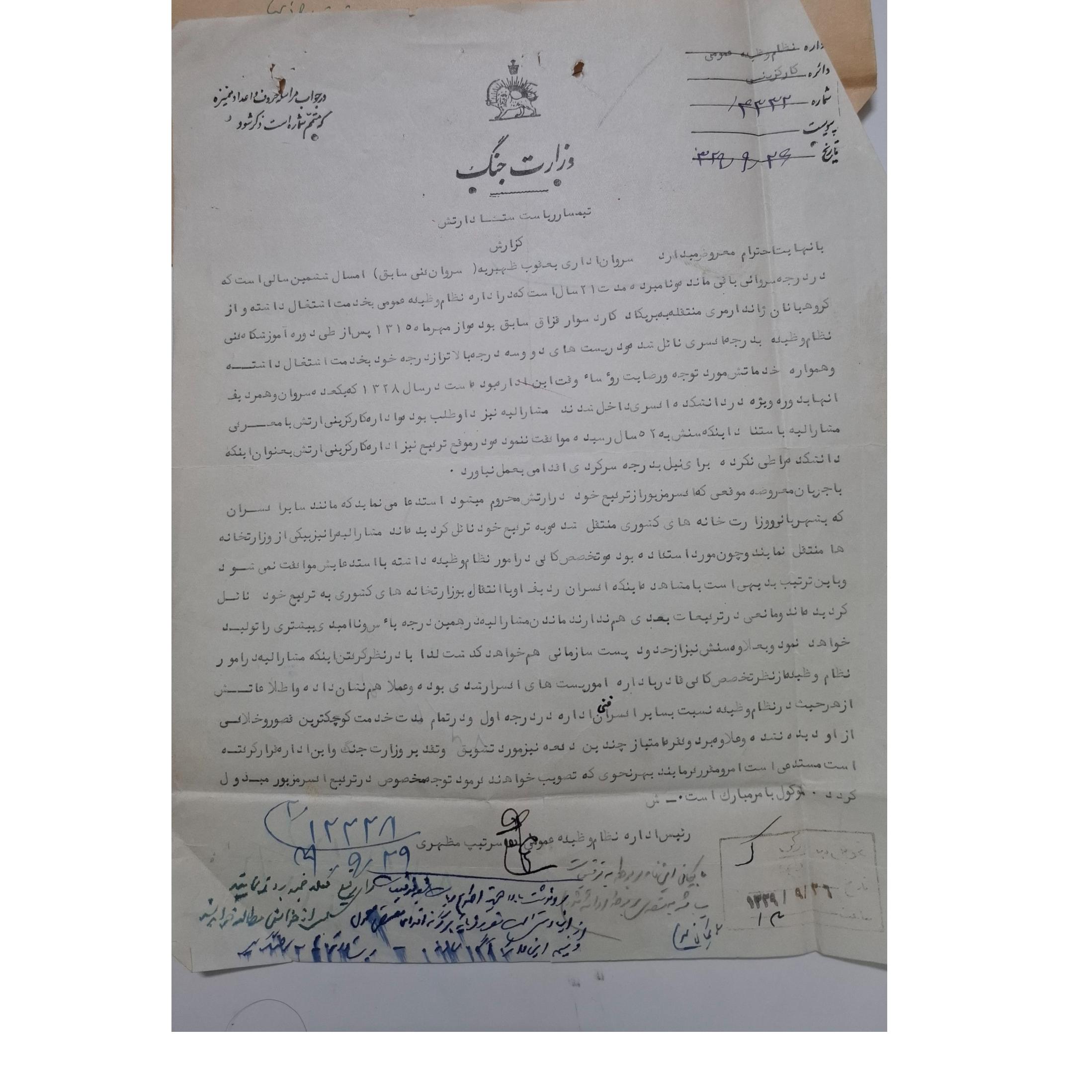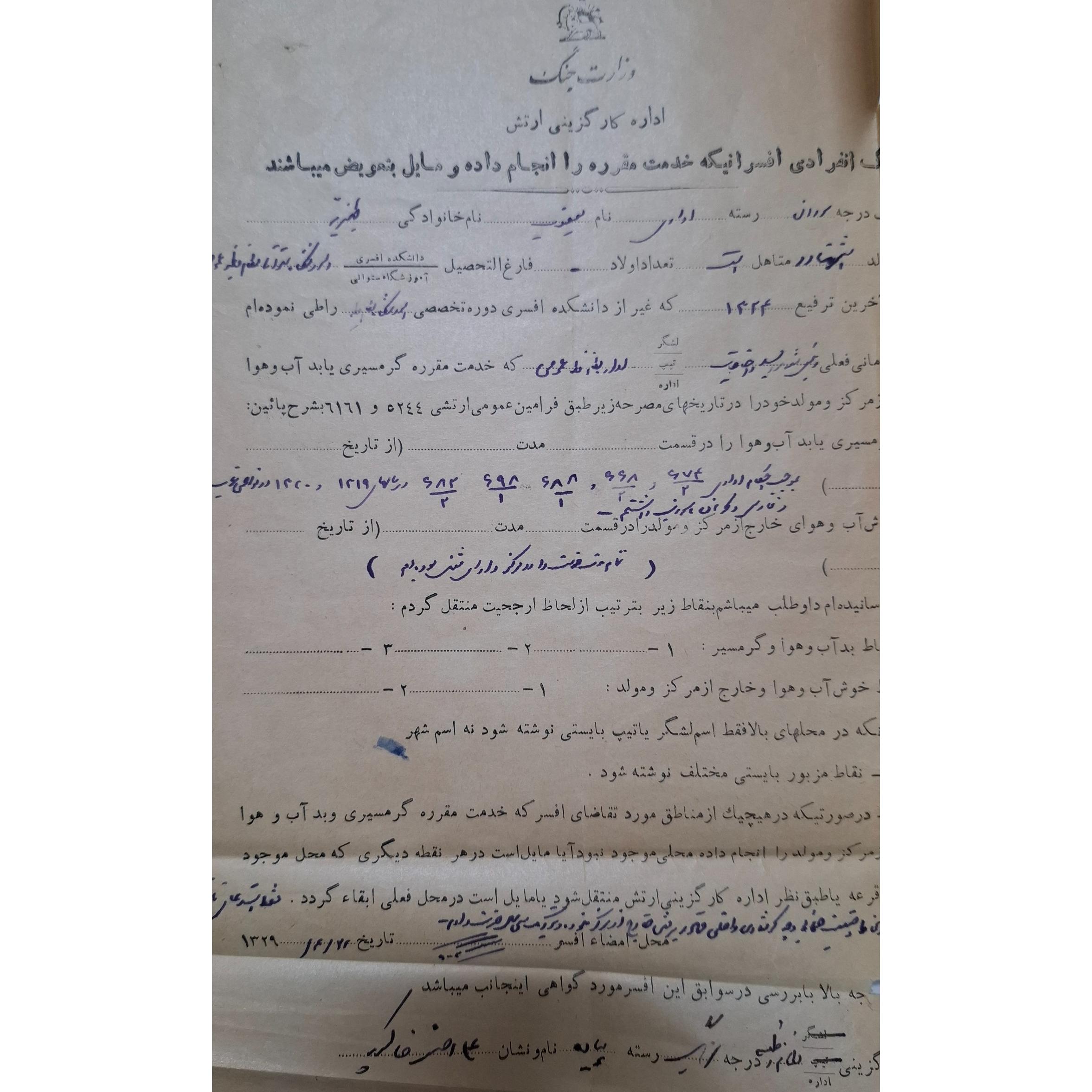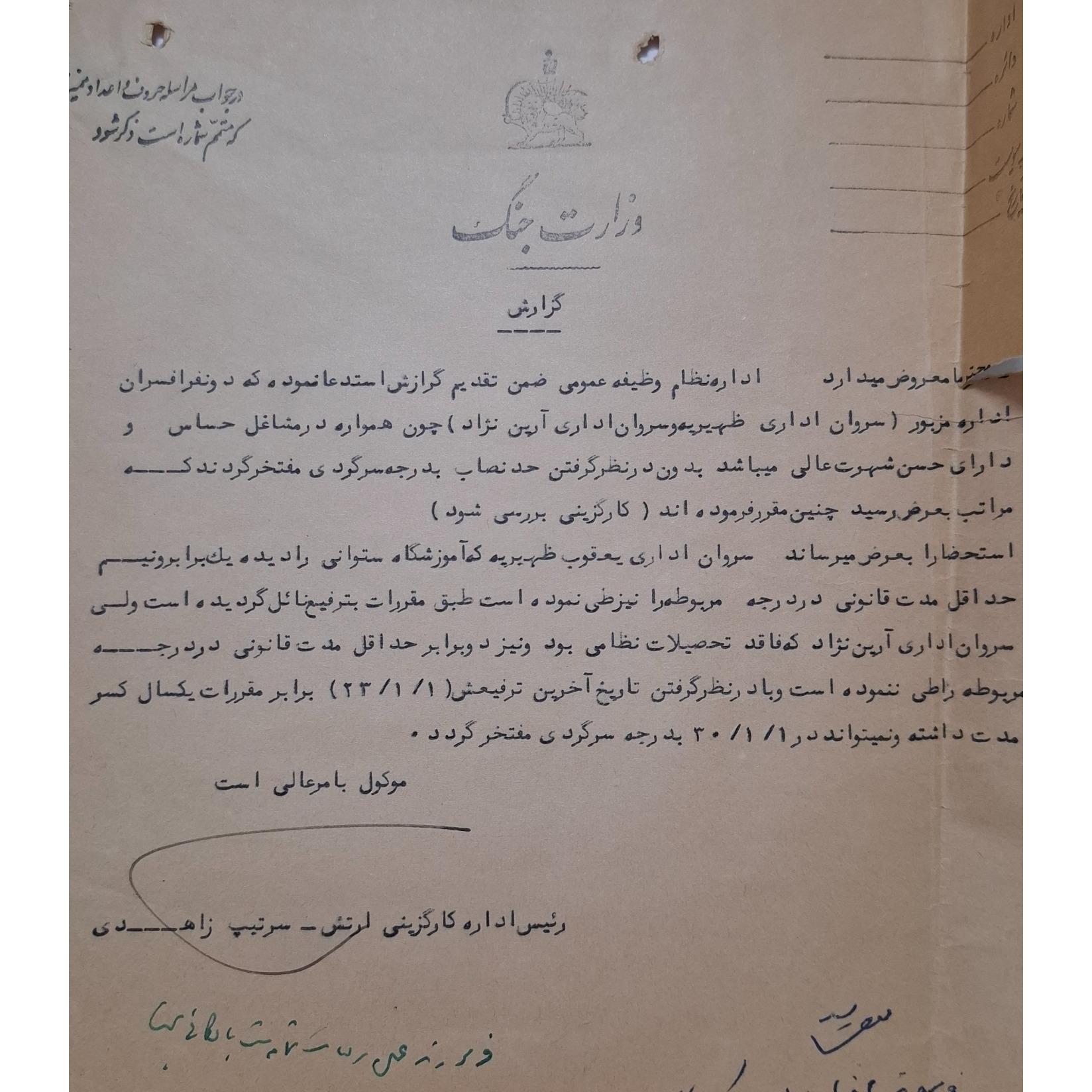 نامه نامه اداره کارگزینی ارتش و گزارش مربوط به یعقوب ظهیریه