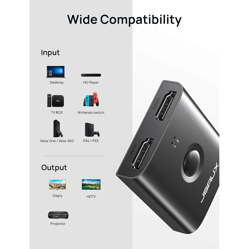 سازگاری گسترده : سوئیچ JSAUX HDMI 4K با اکثر دستگاه های دارای اتصال HDMI استاندارد سازگار است . به عنوان مثال کامپیوتر، PS4، PS4 Pro، XBox 360، Xbox One، Chromecast، TV Stick، پخش کننده Blueray، DVD، ست تاپ باکس ، گیرنده AV، NoteBook، Roku Express، HDTV ، تلویزیون، مانیتور، پروژکتور، پروژکتور، صفحه نمایش، گیرنده ماهواره و غیره .