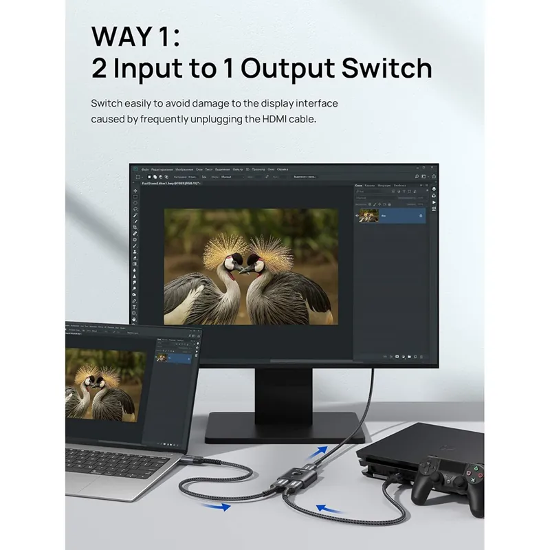 سوئیچ دو طرفه HDMI 4K : با این سوئیچ HDMI 3 پورت ، تقسیم کننده HDMI دو طرفه از اتصال 2 منبع HDMI به یک صفحه نمایش HDMI یا یک منبع HDMI برای جابجایی بین 2 نمایشگر پشتیبانی می کند . تعویض با فشار یک دکمه بسیار آسان است . با 2 نشانگر LED ، می توانید به راحتی تشخیص دهید که کدام دستگاه HDMI در حال اجرا است. بدون نیاز به برق خارجی (توجه: فقط یک صفحه انتخاب شده نمایش داده می شود .)